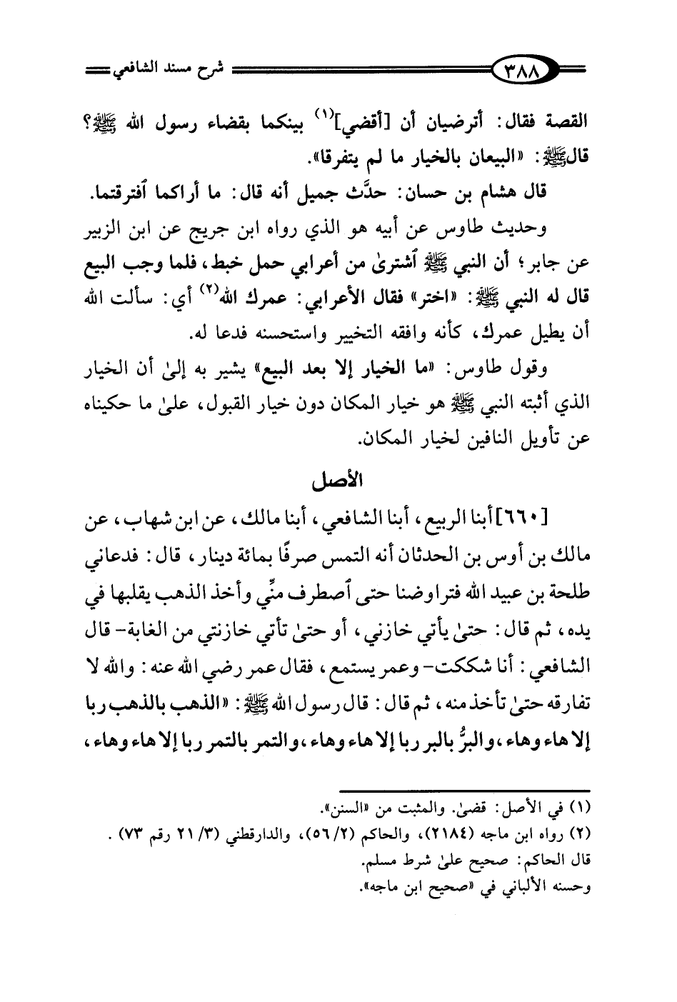 [660] أبنا الربيع، أبنا الشافعي، أبنا مالك، عن ابن شهاب، عن مالك بن أوس بن الحدثان أنه التمس صرفًا بمائة دينار، قال: فدعاني طلحة بن عبيد الله فتراوضنا حتى اصطرف منِّي وأخذ الذهب يقلبها في يده، ثم قال: حتى يأتي خازني، أو حتى تأتي خازنتي من الغابة -قال الشافعي: أنا شككت- وعمر يستمع، فقال عمر رضي الله عنه: والله لا تفارقه حتى تأخذ منه، ثم قال: قال رسول الله - صلى الله عليه وسلم -: "الذهب بالذهب ربا إلا هاء وهاء، والبرُّ بالبر ربا إلا هاء وهاء، والتمر بالتمر ربا إلا هاء وهاء،