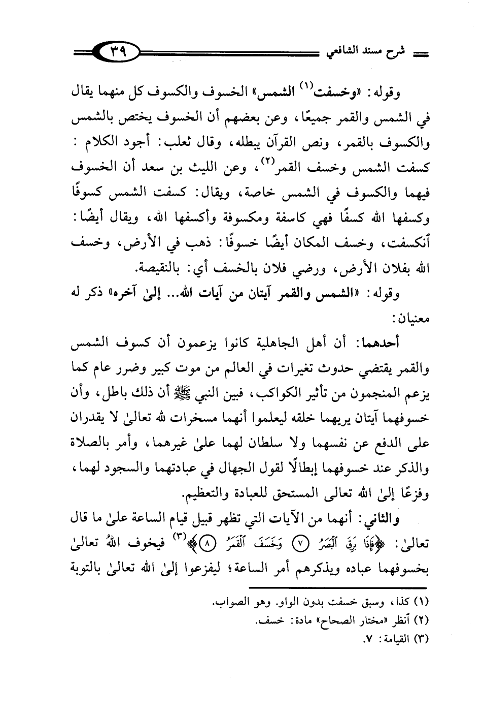 والثاني: أنهما من الآيات التي تظهر قبيل قيام الساعة على ما قال تعالى: {فَإِذَا بَرِقَ الْبَصَرُ (7) وَخَسَفَ الْقَمَرُ (8)} (¬3) فيخوف اللهُ تعالى بخسوفهما عباده ويذكرهم أمر الساعة؛ ليفزعوا إلى الله تعالى بالتوبة