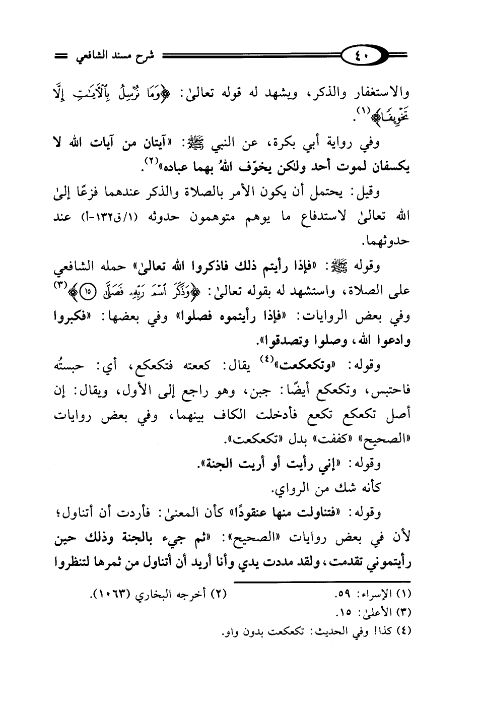وقوله - صلى الله عليه وسلم -: "فإذا رأيتم ذلك فاذكروا الله تعالى" حمله الشافعي على الصلاة، واستشهد له بقوله تعالى: {وَذَكَرَ اسْمَ رَبِّهِ فَصَلَّى (15)} (¬3) وفي بعض الروايات: "فإذا رأيتموه فصلوا" وفي بعضها: "فكبروا وادعوا الله، وصلوا وتصدقوا".