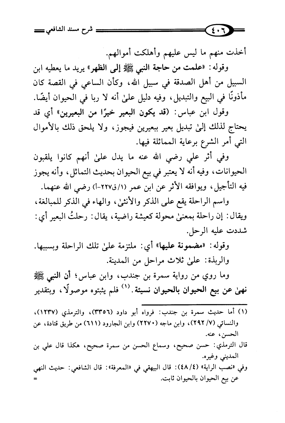 وفي "نصب الراية" (4/ 48): قال البيهقي في "المعرفة": قال الشافعي: حديث النهي عن بيع الحيوان بالحيوان ثابت. =