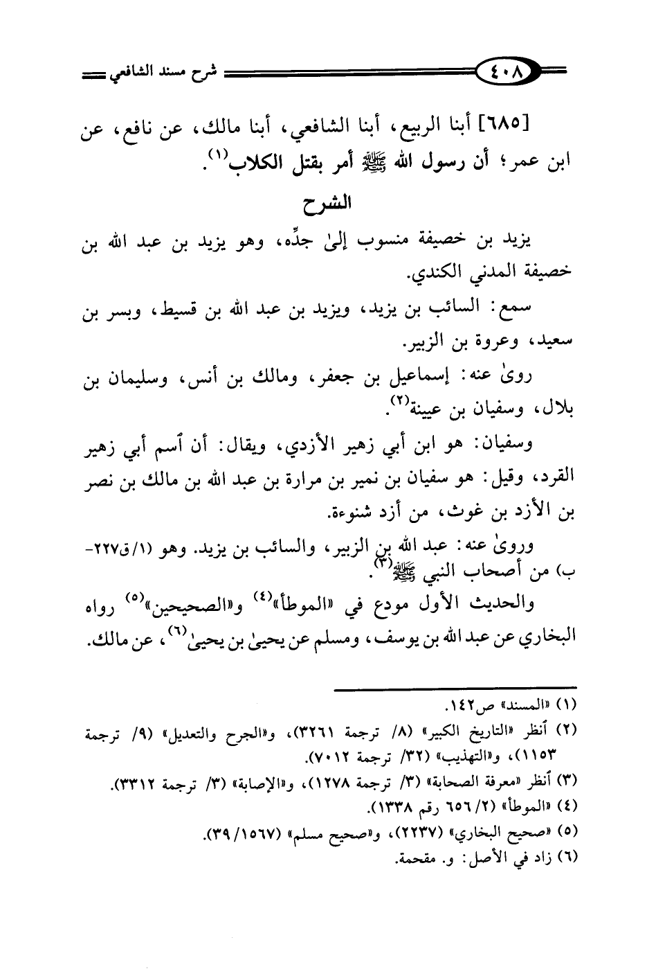 [685] أبنا الربيع، أبنا الشافعي، أبنا مالك، عن نافع عن ابن عمر؛ أن رسول الله - صلى الله عليه وسلم - أمر بقتل الكلاب (¬1).