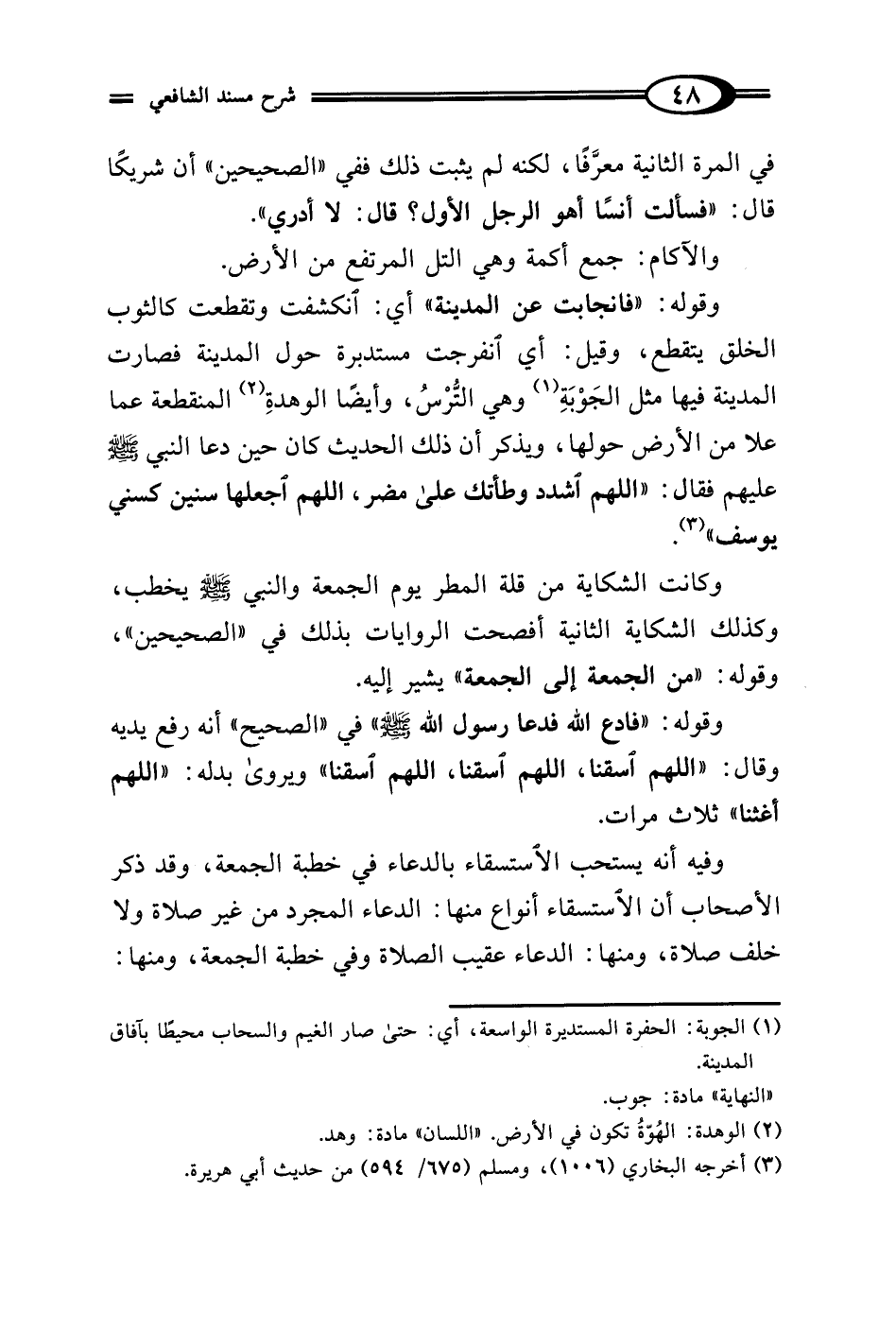 وفيه أنه يستحب الاستسقاء بالدعاء في خطبة الجمعة، وقد ذكر الأصحاب أن الاستسقاء أنواع منها: الدعاء المجرد من غير صلاة ولا خلف صلاة، ومنها: الدعاء عقيب الصلاة وفي خطبة الجمعة، ومنها: