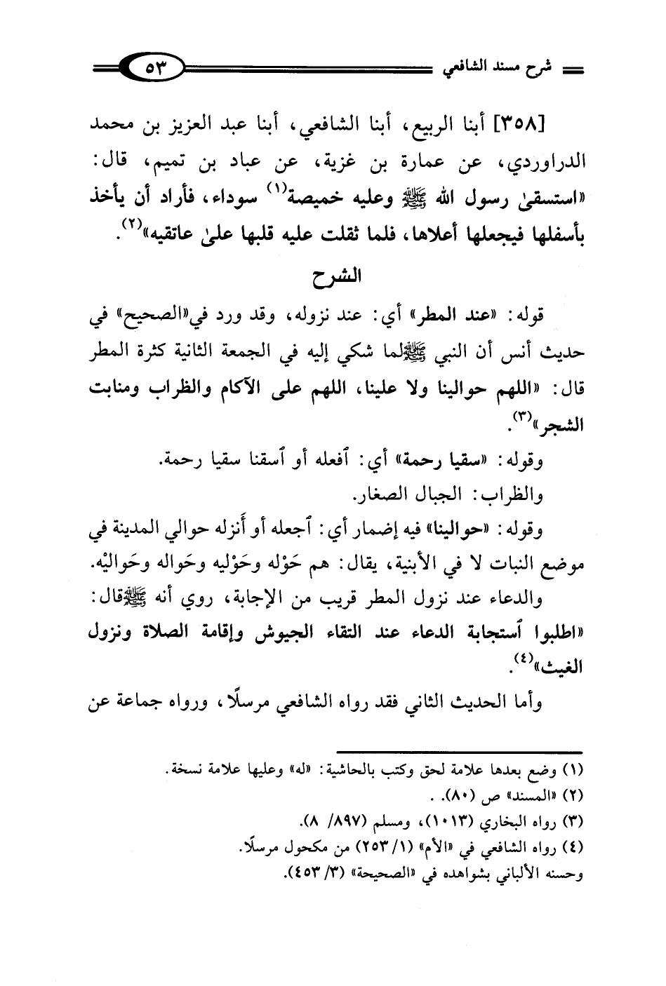 [358] أبنا الربيع، أبنا الشافعي، أبنا عبد العزيز بن محمَّد الدراوردي، عن عمارة بن غزية، عن عباد بن تميم، قال: "استسقى رسول الله - صلى الله عليه وسلم - وعليه خميصة (¬1) سوداء، فأراد أن يأخذ بأسفلها فيجعلها أعلاها، فلما ثقلت عليه قلبها على عاتقيه" (¬2).