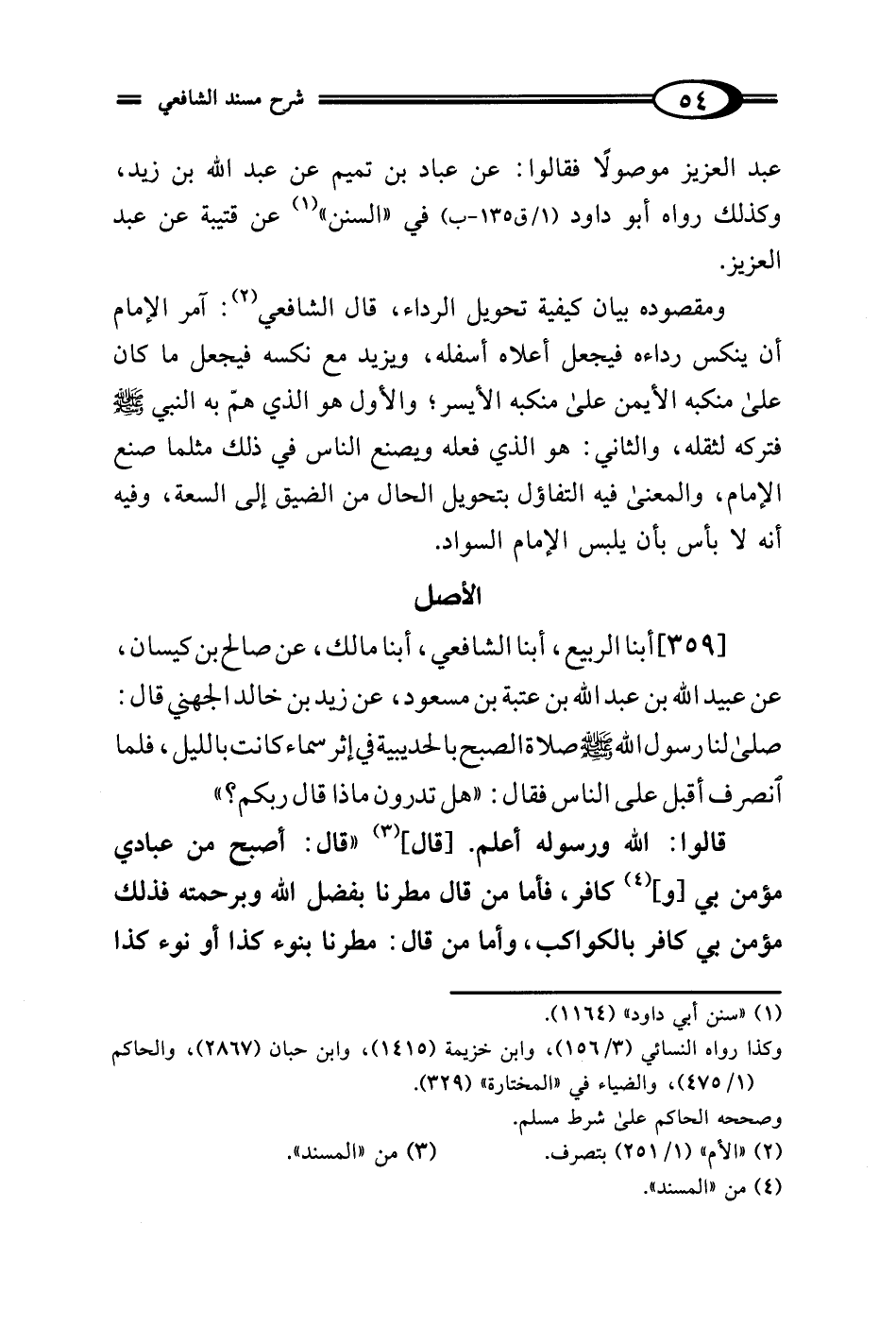 [359] أبنا الربيع، أبنا الشافعي، أبنا مالك، عن صالح بن كيسان، عن عبيد الله بن عبد الله بن عتبة بن مسعود، عن زيد بن خالد الجهني قال: صلى لنا رسول الله - صلى الله عليه وسلم - صلاة الصبح بالحديبية في إثر سماء كانت بالليل، فلما انصرف أقبل على الناس فقال: "هل تدرون ماذا قال ربكم؟ ".