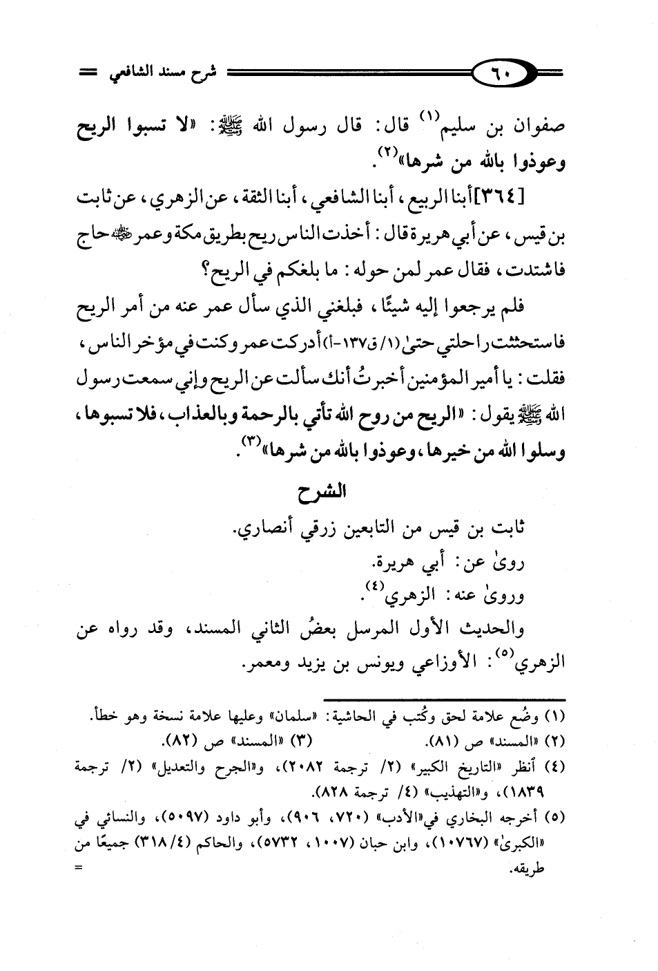 [364] أبنا الربيع، أبنا الشافعي، أبنا الثقة، عن الزهري، عن ثابت بن قيس، عن أبي هريرة قال: أخذت الناس ريح بطريق مكة وعمر -رضي الله عنه- حاج فاشتدت، فقال عمر لمن حوله: ما بلغكم في الريح؟