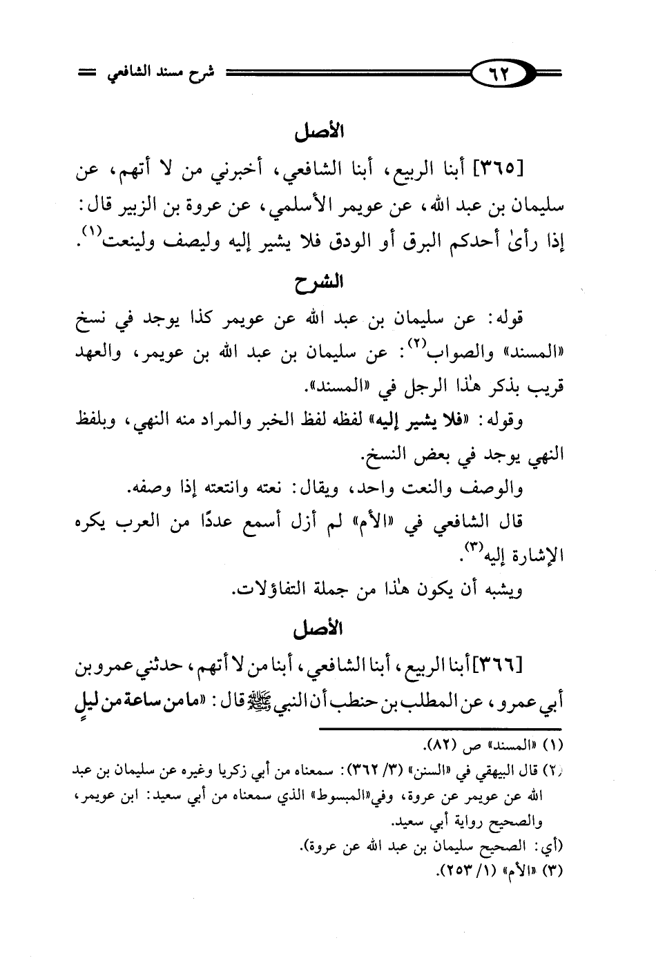 [365] أبنا الربيع، أبنا الشافعي، أخبرني من لا أتهم، عن سليمان بن عبد الله، عن عويمر الأسلمي، عن عروة بن الزبير قال: إذا رأى أحدكم البرق أو الودق فلا يشير إليه وليصف ولينعت (¬1).
