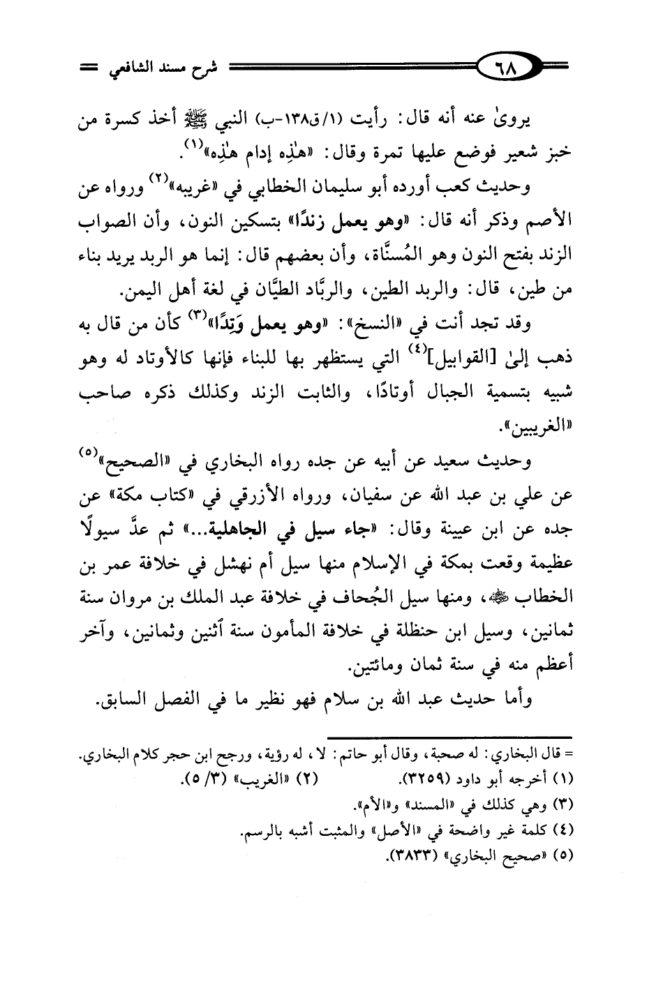 وحديث كعب أورده أبو سليمان الخطابي في "غريبه" (¬2) ورواه عن الأصم وذكر أنه قال: "وهو يعمل زندًا" بتسكين النون، وأن الصواب الزند بفتح النون وهو المُسنَّاة، وأن بعضهم قال: إنما هو الربد يريد بناء من طين، قال: والربد الطين، والربَّاد الطيَّان في لغة أهل اليمن.