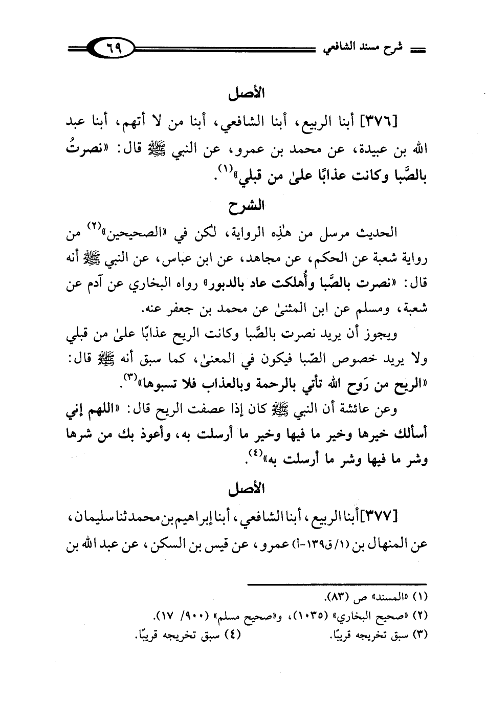 [376] أبنا الربيع، أبنا الشافعي، أبنا من لا أتهم، أبنا عبد الله بن عبيدة، عن محمَّد بن عمرو، عن النبي - صلى الله عليه وسلم - قال: "نصرتُ بالصَّبا وكانت عذابًا على من قبلي" (¬1).