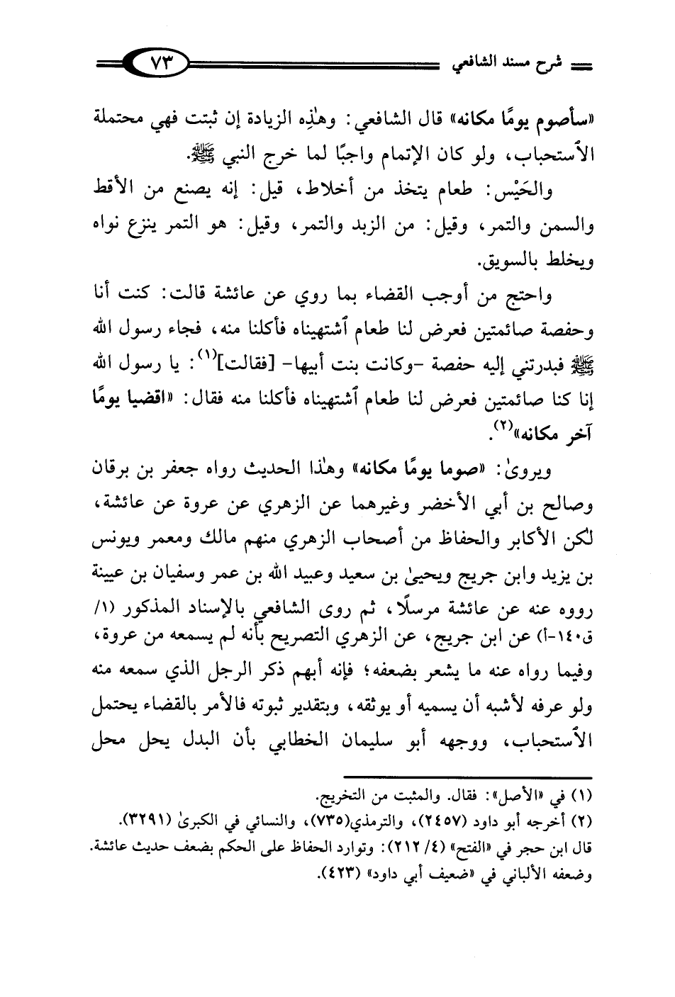 "سأصوم يومًا مكانه" قال الشافعي: وهذه الزيادة إن ثبتت فهي محتملة الاستحباب، ولو كان الإتمام واجبًا لما خرج النبي - صلى الله عليه وسلم -.