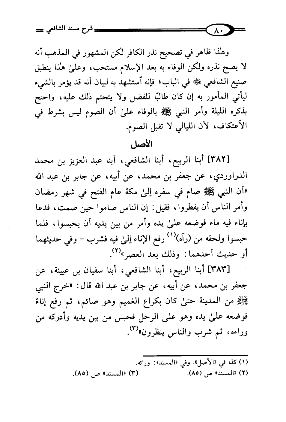 [383] أبنا الربيع، أبنا الشافعي، أبنا سفيان بن عيينة، عن جعفر بن محمَّد، عن أبيه، عن جابر بن عبد الله قال: "خرج النبي - صلى الله عليه وسلم - من المدينة حتى كان بكراع الغميم وهو صائم، ثم رفع إناءً فوضعه على يده وهو على الرحل فحبس من بين يديه وأدركه من وراءه، ثم شرب والناس ينظرون" (¬3).