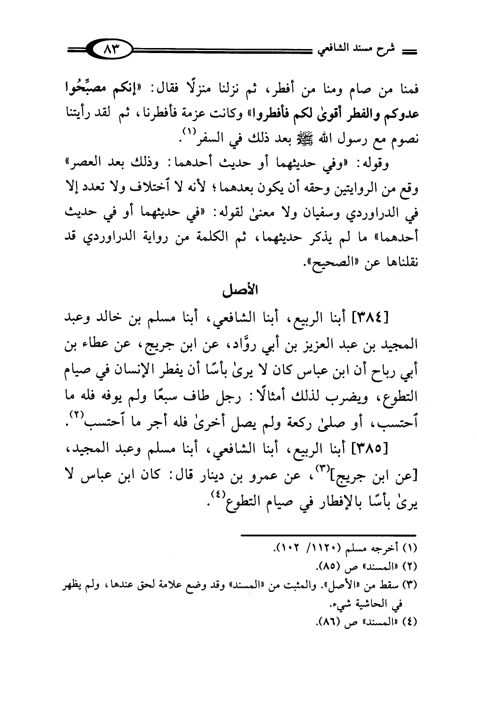 [384] أبنا الربيع، أبنا الشافعي، أبنا مسلم بن خالد وعبد المجيد بن عبد العزيز بن أبي روَّاد، عن ابن جريج، عن عطاء بن أبي رباح أن ابن عباس كان لا يرى بأسًا أن يفطر الإنسان في صيام التطوع، ويضرب لذلك أمثالًا: رجل طاف سبعًا ولم يوفه فله ما احتسب، أو صلى ركعة ولم يصل أخرى فله أجر ما احتسب (¬2).