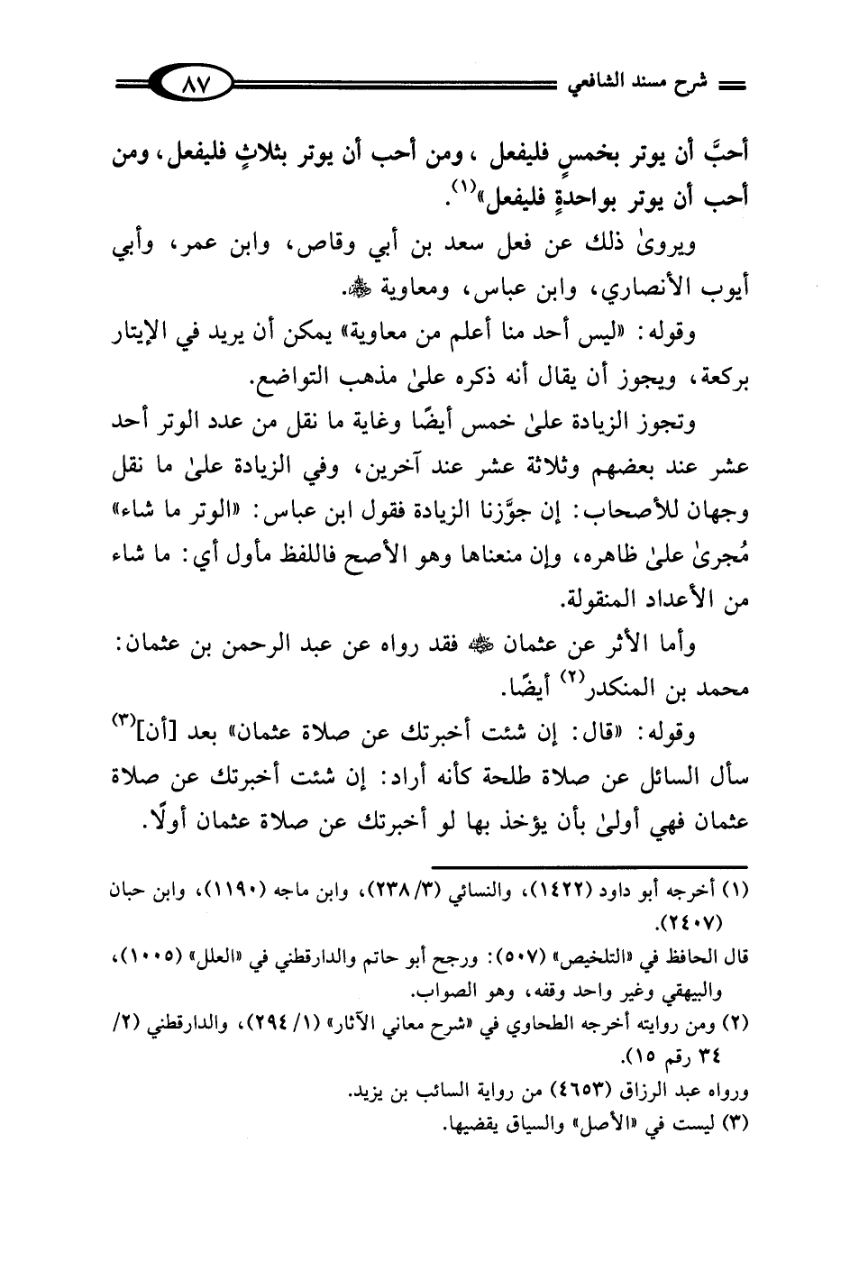 وتجوز الزيادة على خمس أيضًا وغاية ما نقل من عدد الوتر أحد عشر عند بعضهم وثلاثة عشر عند آخرين، وفي الزيادة على ما نقل وجهان للأصحاب: إن جوَّزنا الزيادة فقول ابن عباس: "الوتر ما شاء" مُجرى على ظاهره، وإن منعناها وهو الأصح فاللفظ مأول أي: ما شاء من الأعداد المنقولة.