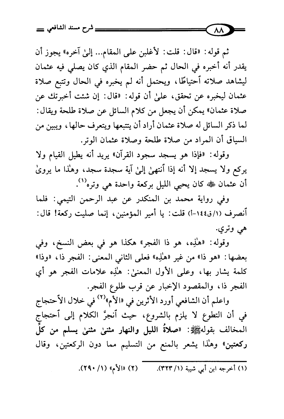 ثم قوله: "قال: قلت: لأغلبن على المقام ... إلى آخره" يجوز أن يقدر أنه أخبره في الحال ثم حضر المقام الذي كان يصلي فيه عثمان ليشاهد صلاته احتياطًا، ويحتمل أنه لم يخبره في الحال وتتبع صلاة عثمان ليخبره عن تحقق، على أن قوله: "قال: إن شئت أخبرتك عن صلاة عثمان" يمكن أن يجعل من كلام السائل عن صلاة طلحة ويقال: لما ذكر السائل له صلاة عثمان أراد أن يتتبعها ويتعرف حالها، ويبين من السياق أن المراد من صلاة طلحة وصلاة عثمان الوتر.