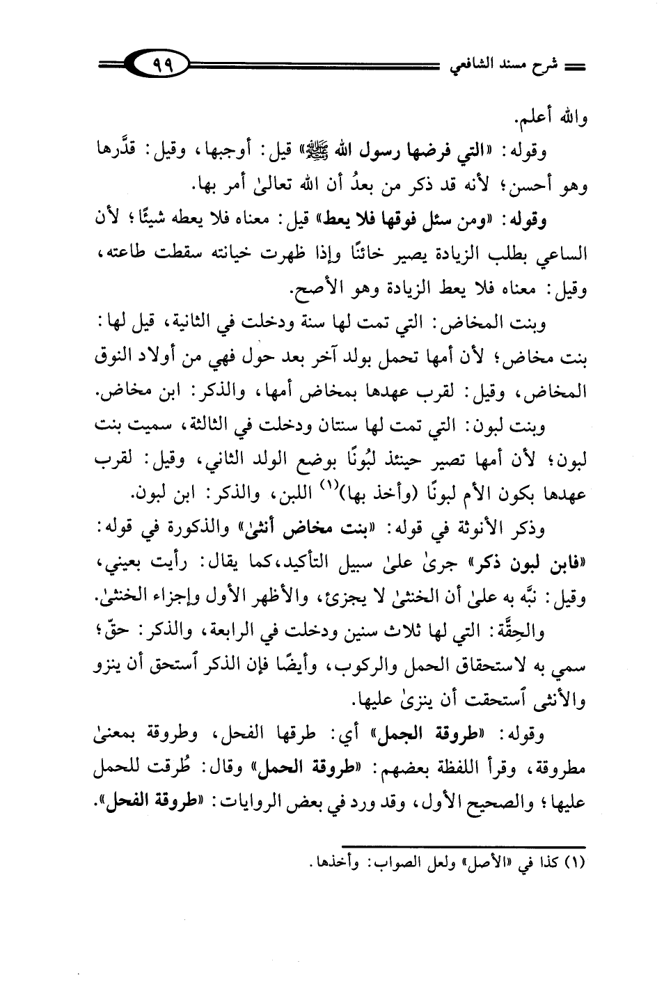 وبنت المخاض: التي تمت لها سنة ودخلت في الثانية، قيل لها: بنت مخاض؛ لأن أمها تحمل بولد آخر بعد حول فهي من أولاد النوق المخاض، وقيل: لقرب عهدها بمخاض أمها، والذكر: ابن مخاض.