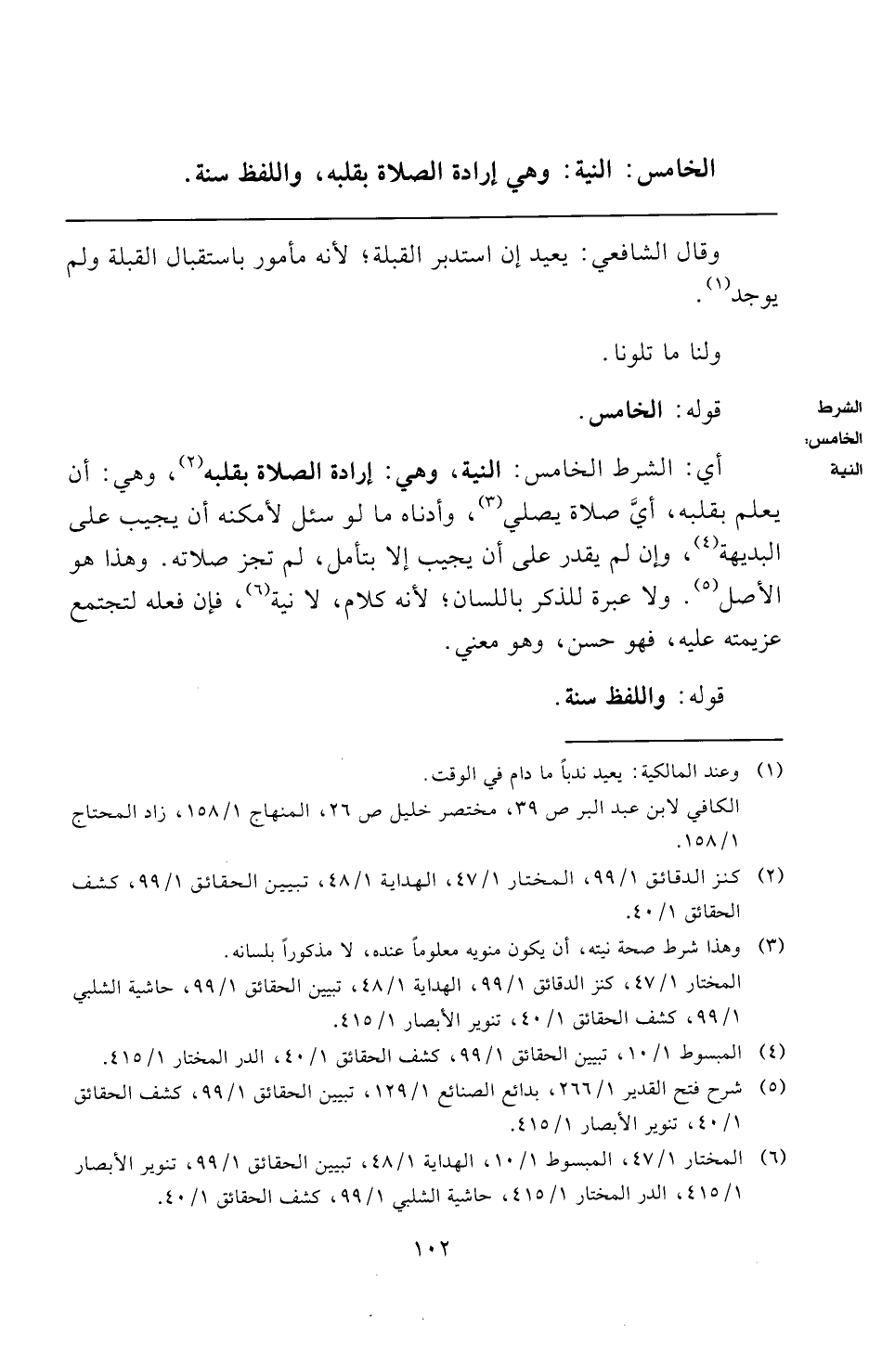 أي: الشرط الخامس: النية، وهي: إرادة الصلاة بقلبه (¬٢)، وهي: أن يعلم بقلبه، أيَّ صلاة يصلي (¬٣)، وأدناه ما لو سئل لأمكنه أن يجيب على البديهة (¬٤)، وإن لم يقدر على أن يجيب إلا بتأمل، لم تجز صلاته. وهذا هو الأصل (¬٥). ولا عبرة للذكر باللسان؛ لأنه كلام، لا نية (¬٦)، فإن فعله لتجتمع عزيمته عليه، فهو حسن، وهو معني.