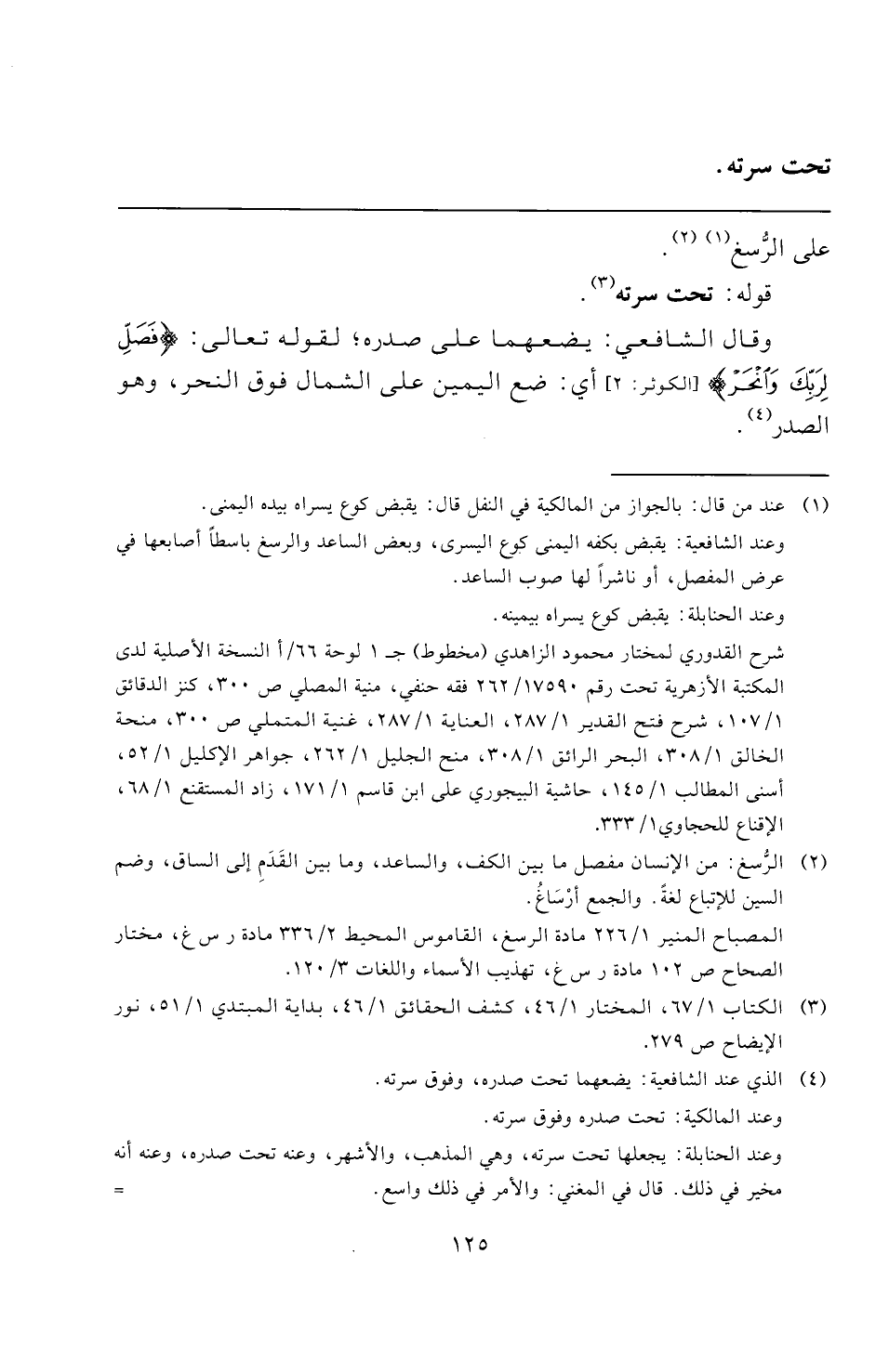 وعند الحنابلة: يجعلها تحت سرته، وهي المذهب، والأشهر، وعنه تحت صدره، وعنه أنه مخير في ذلك. قال في المغني: والأمر في ذلك واسع. =