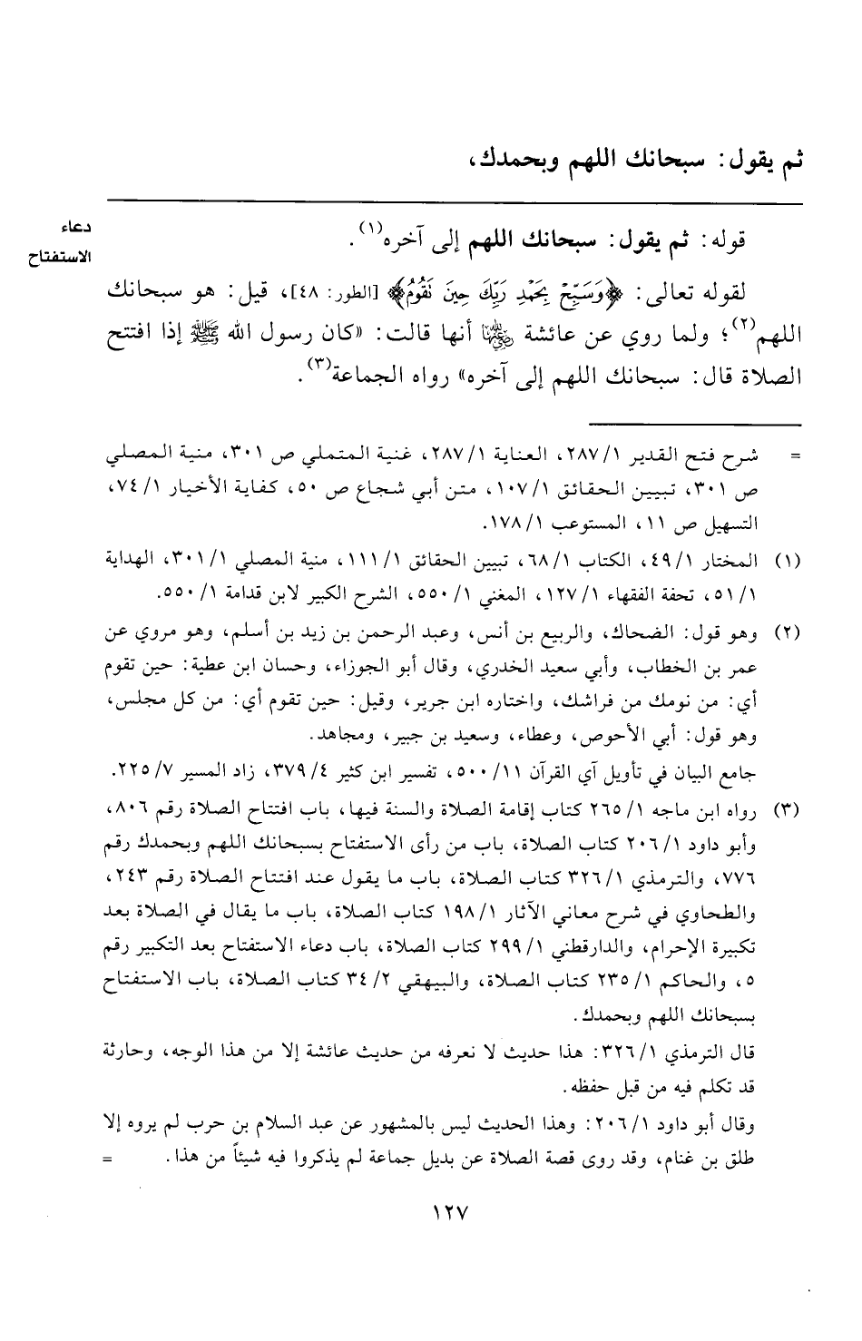 (¬٣) رواه ابن ماجه ١/ ٢٦٥ كتاب إقامة الصلاة والسنة فيها، باب افتتاح الصلاة رقم ٨٠٦، وأبو داود ١/ ٢٠٦ كتاب الصلاة، باب من رأى الاستفتاح بسبحانك اللهم وبحمدك رقم ٧٧٦، والترمذي ١/ ٣٢٦ كتاب الصلاة، باب ما يقول عند افتتاح الصلاة رقم ٢٤٣، والطحاوي في شرح معاني الآثار ١/ ١٩٨ كتاب الصلاة، باب ما يقال في الصلاة بعد تكبيرة الإحرام، والدارقطني ١/ ٢٩٩ كتاب الصلاة، باب دعاء الاستفتاح بعد التكبير رقم ٥، والحاكم ١/ ٢٣٥ كتاب الصلاة، والبيهقي ٢/ ٣٤ كتاب الصلاة، باب الاستفتاح بسبحانك اللهم وبحمدك.