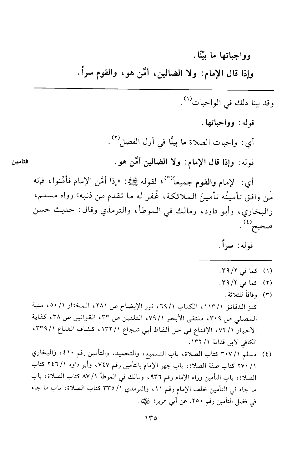 (¬٤) مسلم ١/ ٣٠٧ كتاب الصلاة، باب التسميع، والتحميد، والتأمين رقم ٤١٠، والبخاري ١/ ٢٧٠ كتاب صفة الصلاة، باب جهر الإمام بالتأمين رقم ٧٤٧، وأبو داود ١/ ٢٤٦ كتاب الصلاة، باب التأمين وراء الإمام رقم ٩٣٦، ومالك في الموطأ ١/ ٨٧ كتاب الصلاة، باب ما جاء في التأمين خلف الإمام رقم ١١، والترمذي ١/ ٣٣٥ كتاب الصلاة، باب ما جاء في فضل التأمين رقم ٢٥٠. عن أبي هريرة -رضي الله عنه-.