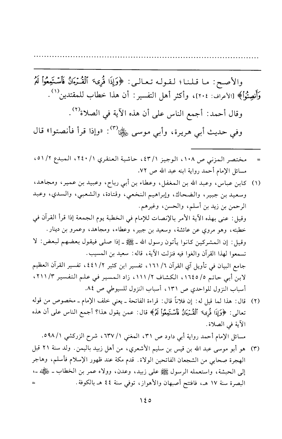 (¬٢) قال: هذا لما قيل له: إن فلانًا قال: قراءة الفاتحة -يعني خلف الإمام- مخصوص من قوله تعالى: {وَإِذَا قُرِئَ الْقُرْآنُ فَاسْتَمِعُوا لَهُ} قال: عمن يقول هذا؟ أجمع الناس على أن هذه الآية في الصلاة.