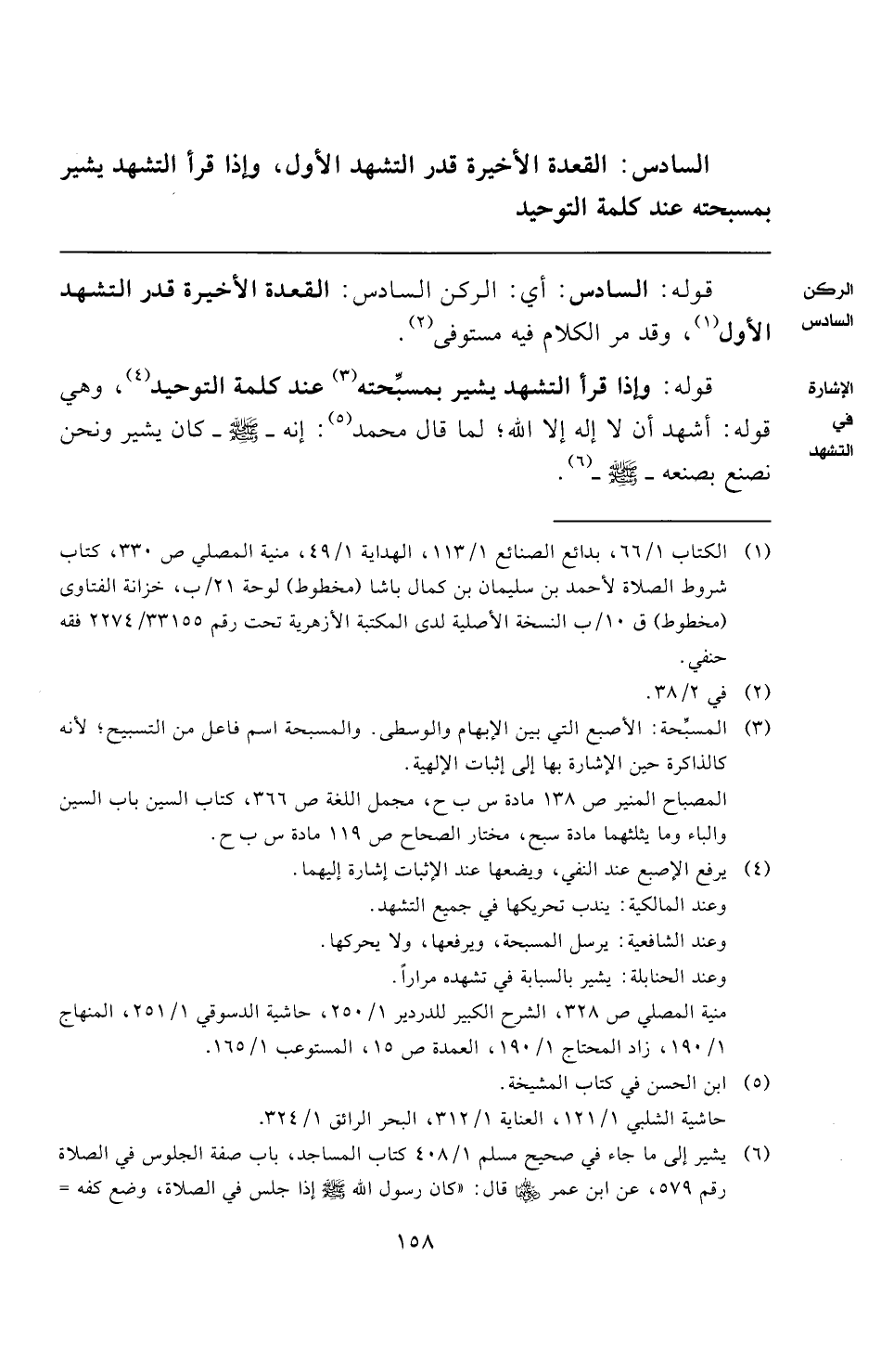 السادس: القعدة الأخيرة قدر التشهد الأول، وإذا قرأ التشهد يشير بمسبحته عند كلمة التوحيد.