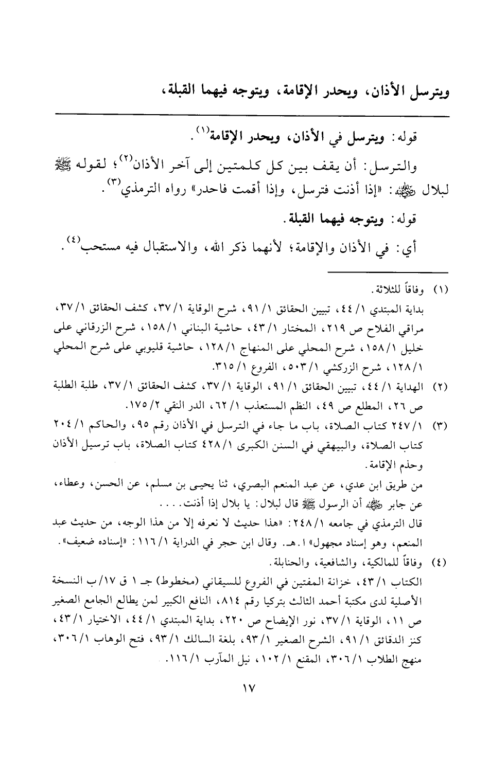 (¬٣) ١/ ٢٤٧ كتاب الصلاة، باب ما جاء في الترسل في الأذان رقم ٩٥، والحاكم ١/ ٢٠٤ كتاب الصلاة، والبيهقي في السنن الكبرى ١/ ٤٢٨ كتاب الصلاة، باب ترسيل الأذان وحذم الإقامة.