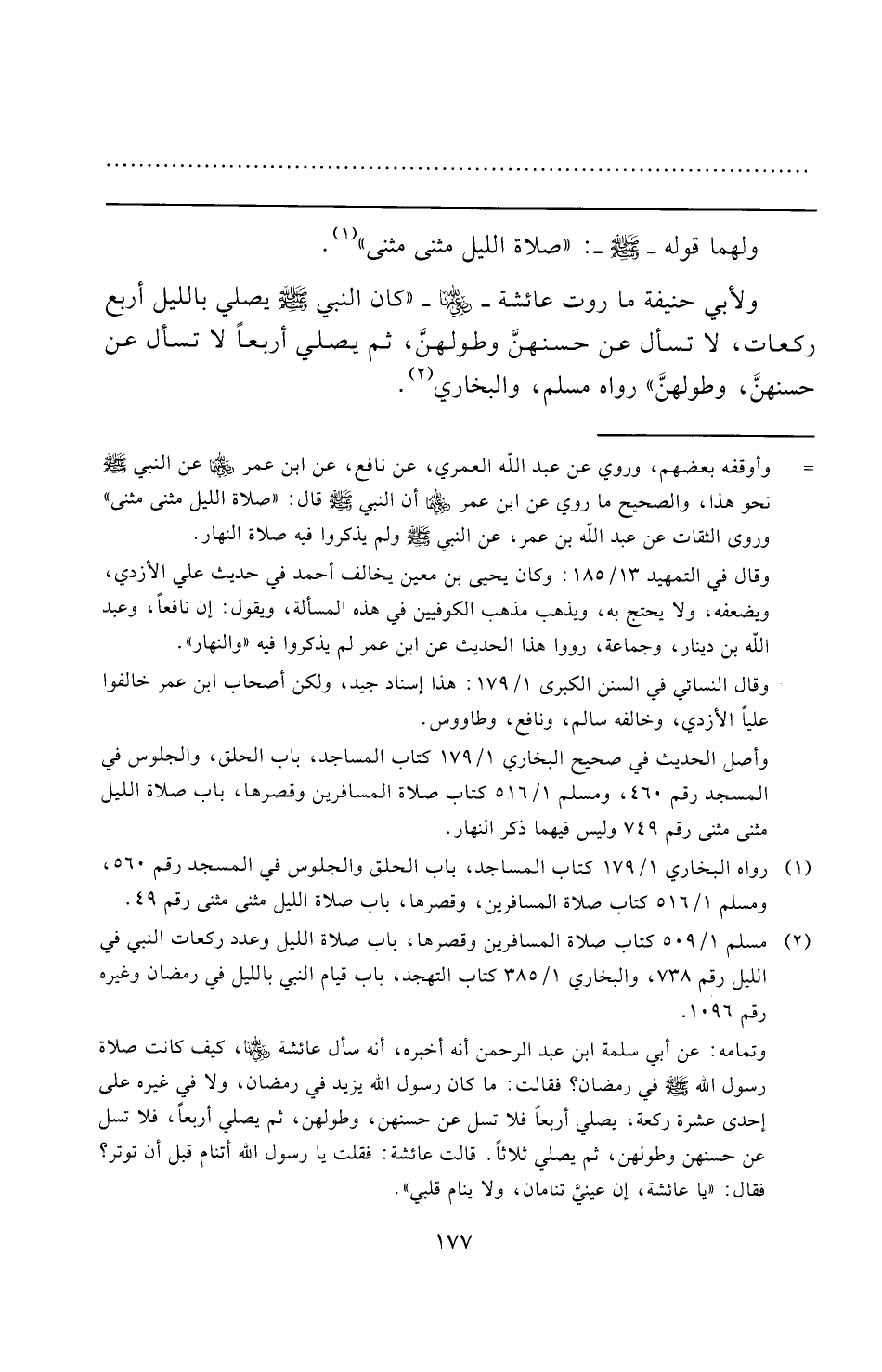 (¬٢) مسلم ١/ ٥٠٩ كتاب صلاة المسافرين وقصرها، باب صلاة الليل وعدد ركعات النبي في الليل رقم ٧٣٨، والبخاري ١/ ٣٨٥ كتاب التهجد، باب قيام النبي بالليل في رمضان وغيره رقم ١٠٩٦.