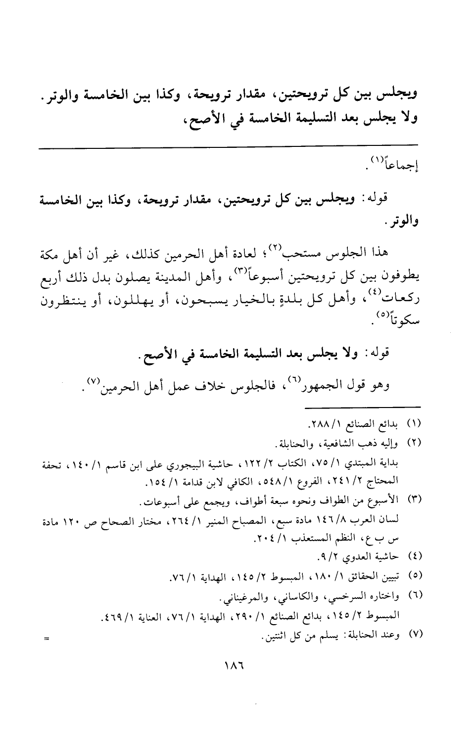 هذا الجلوس مستحب (¬٢)؛ لعادة أهل الحرمين كذلك، غير أن أهل مكة يطوفون بين كل ترويحتين أسبوعًا (¬٣)، وأهل المدينة يصلون بدل ذلك أربع ركعات (¬٤)، وأهل كل بلدةٍ بالخيار يسبحون، أو يهللون، أو ينتظرون سكوتًا (¬٥).
