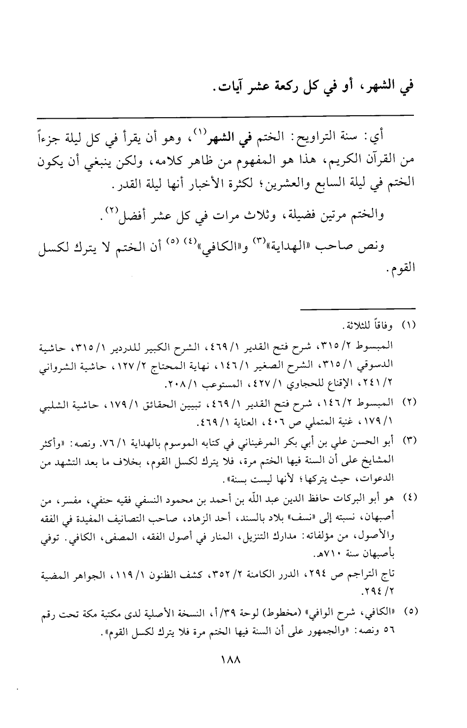 (¬٥) "الكافي، شرح الوافي" (مخطوط) لوحة ٣٩/ أ، النسخة الأصلية لدى مكتبة مكة تحت رقم ٥٦ ونصه: "والجمهور على أن السنة فيها الختم مرة فلا يترك لكسل القوم".