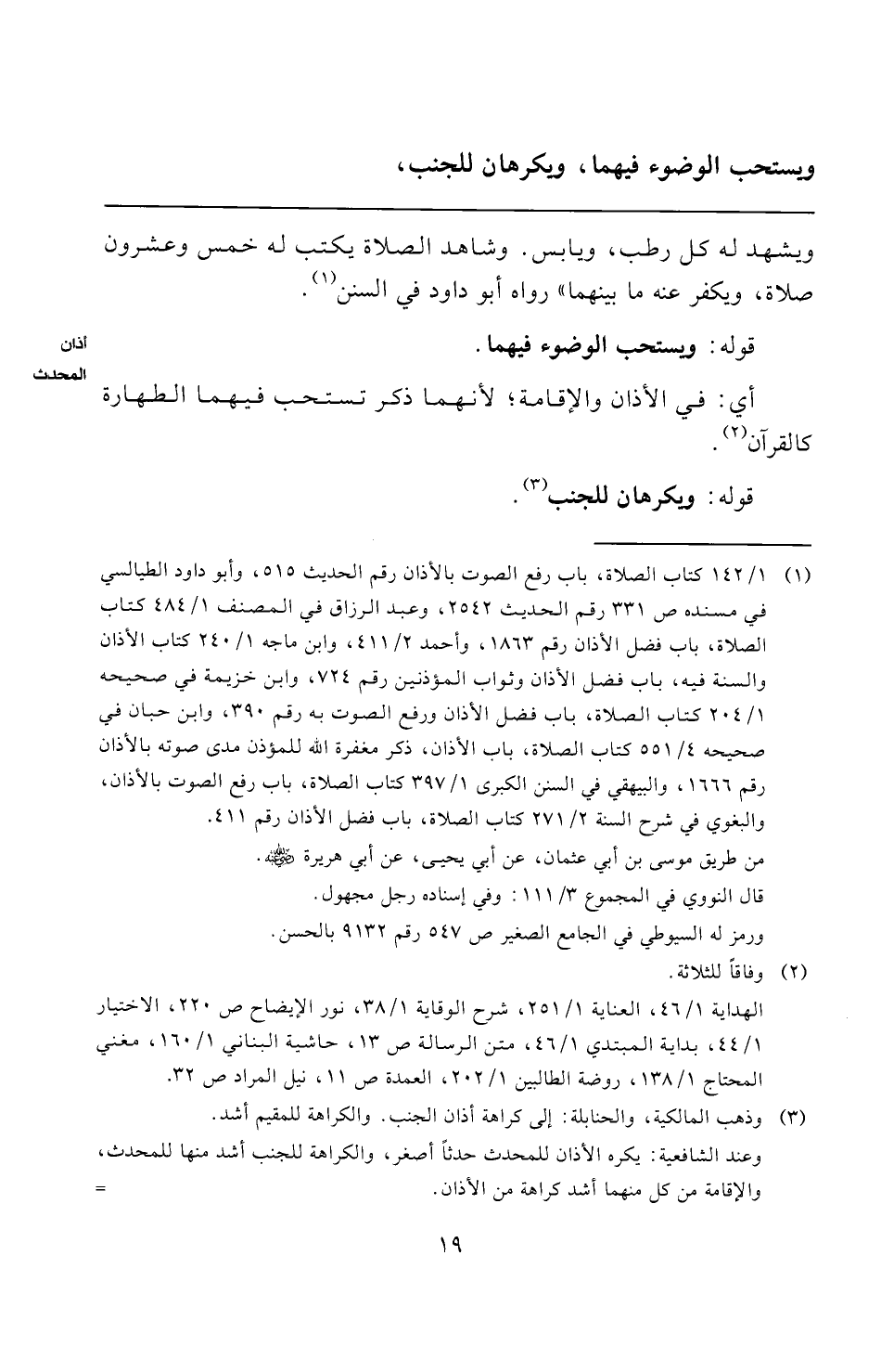 (¬٣) وذهب المالكية، والحنابلة: إلى كراهة أذان الجنب. والكراهة للمقيم أشد.
