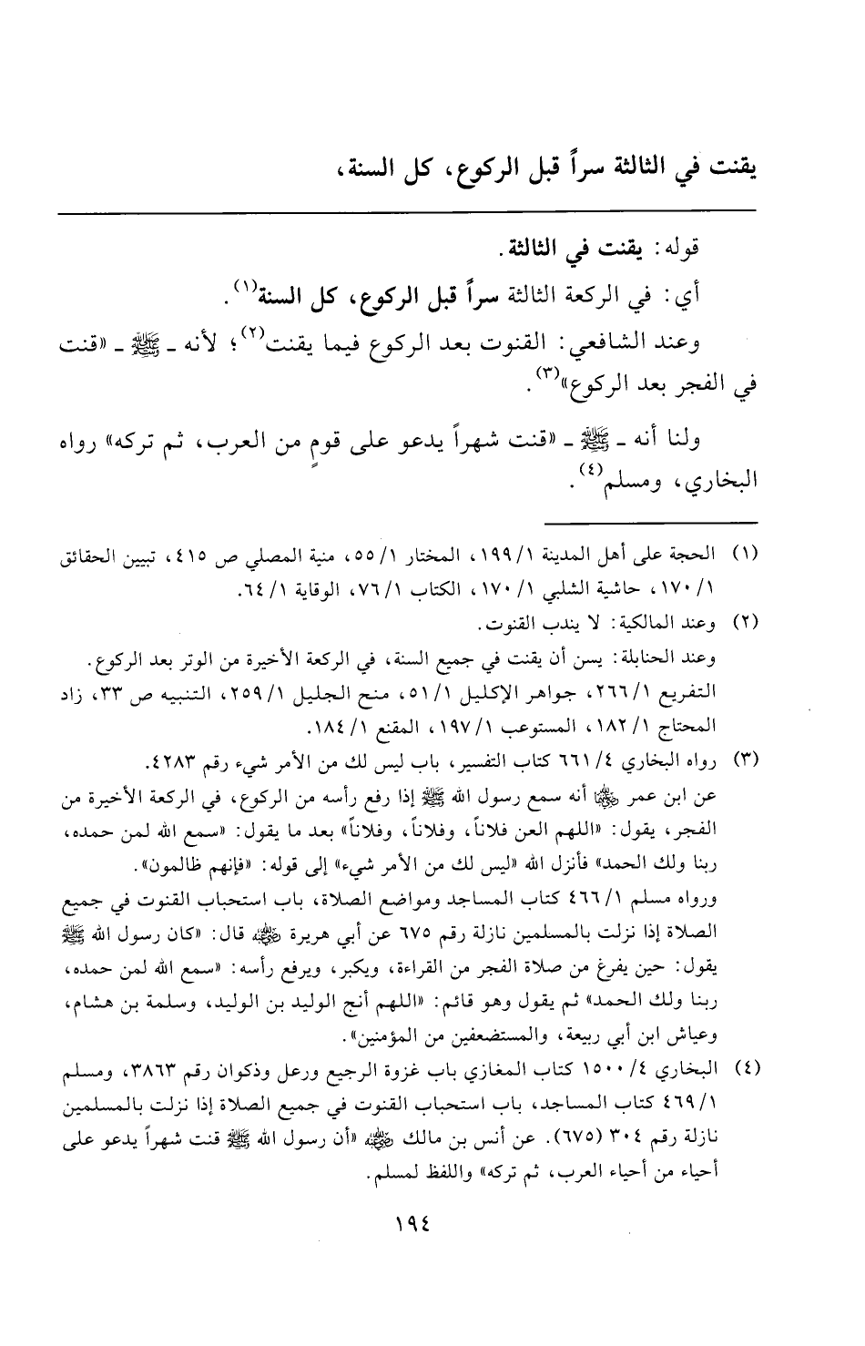 (¬٤) البخاري ٤/ ١٥٠٠ كتاب المغازي باب غزوة الرجيع ورعل وذكوان رقم ٣٨٦٣، ومسلم ١/ ٤٦٩ كتاب المساجد، باب استحباب القنوت في جميع الصلاة إذا نزلت بالمسلمين نازلة رقم ٣٠٤ (٦٧٥). عن أنس بن مالك -رضي الله عنه- "أن رسول الله -صلى الله عليه وسلم- قنت شهرًا يدعو على أحياء من أحياء العرب، ثم تركه" واللفظ لمسلم.