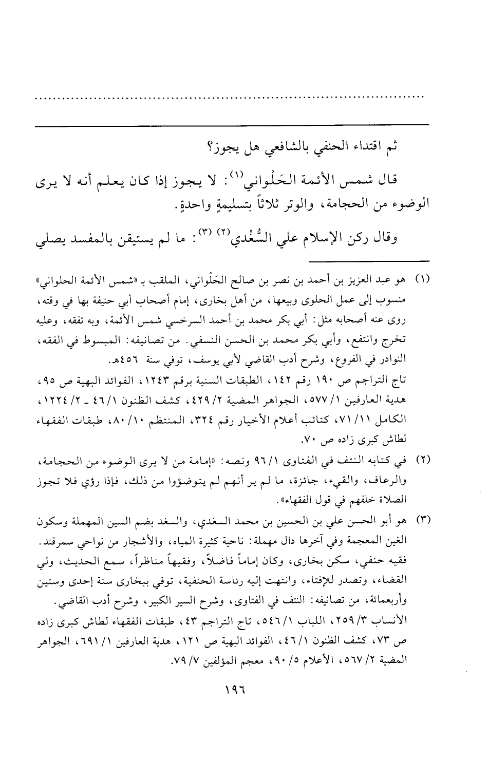 (¬٢) في كتابه النتف في الفتاوى ١/ ٩٦ ونصه: "إمامة من لا يرى الوضوء من الحجامة، والرعاف، والقيء، جائزة، ما لم ير أنهم لم يتوضؤوا من ذلك، فإذا رؤي فلا تجوز الصلاة خلفهم في قول الفقهاء".