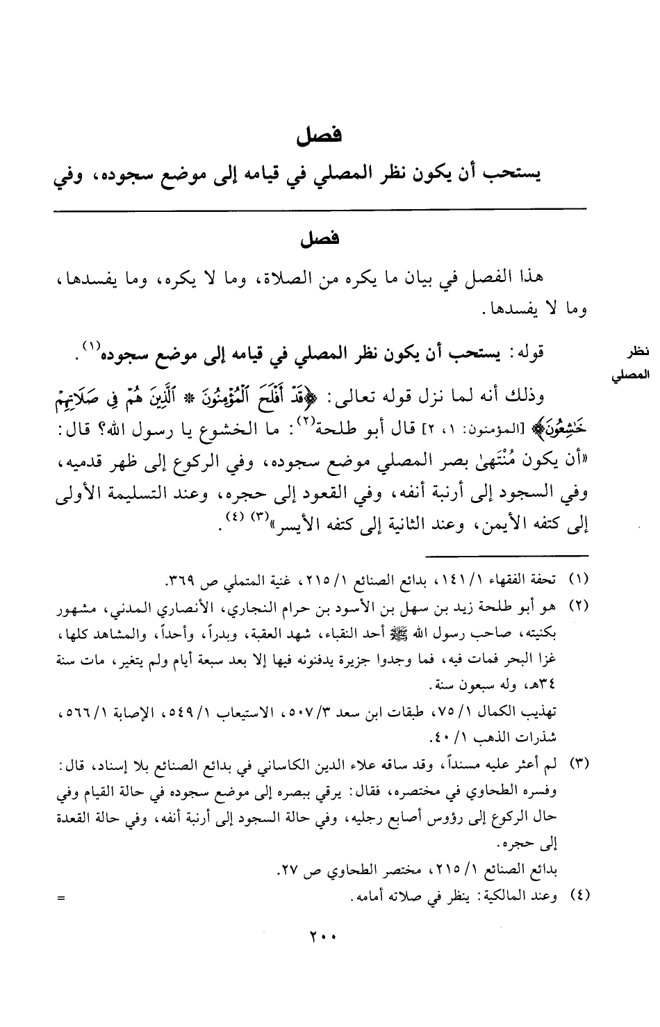 (¬٣) لم أعثر عليه مسندًا، وقد ساقه علاء الدين الكاساني في بدائع الصنائع بلا إسناد، قال: وفسره الطحاوي في مختصره، فقال: يرقي ببصره إلى موضع سجوده في حالة القيام وفي حال الركوع إلى رؤوس أصابع رجليه، وفي حالة السجود إلى أرنبة أنفه، وفي حالة القعدة إلى حجره.