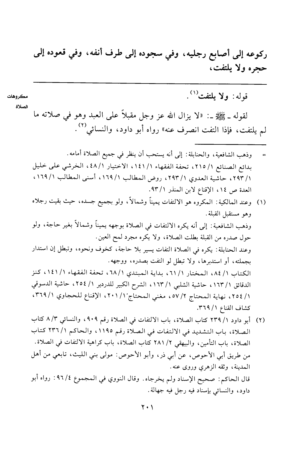 (¬٢) أبو داود ١/ ٢٣٩ كتاب الصلاة، باب الالتفات في الصلاة رقم ٩٠٩، والنسائي ٣/ ٨ كتاب الصلاة، باب التشديد في الالتفات في الصلاة رقم ١١٩٥، والحاكم ١/ ٢٣٦ كتاب الصلاة، باب التأمين، والبيهقي ٢/ ٢٨١ كتاب الصلاة، باب كراهية الالتفات في الصلاة.