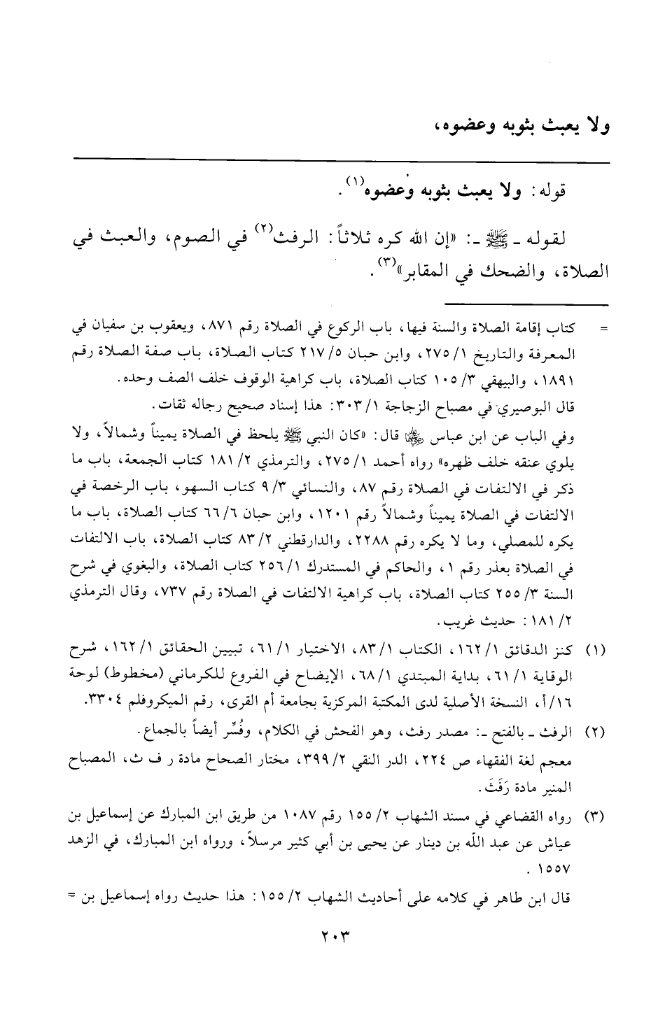 قوله: ولا يعبث بثوبه وعضوه (¬١).