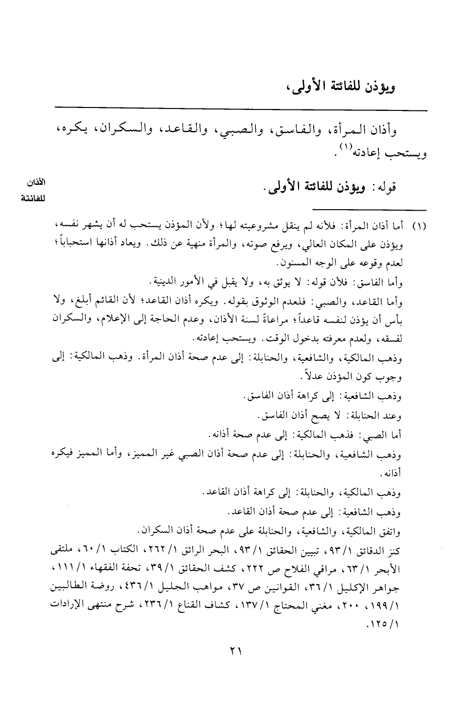 (¬١) أما أذان المرأة: فلأنه لم ينقل مشروعيته لها؛ ولأن المؤذن يستحب له أن يشهر نفسه، ويؤذن على المكان العالي، ويرفع صوته، والمرأة منهية عن ذلك. ويعاد أذانها استحبابًا؛ لعدم وقوعه على الوجه المسنون.