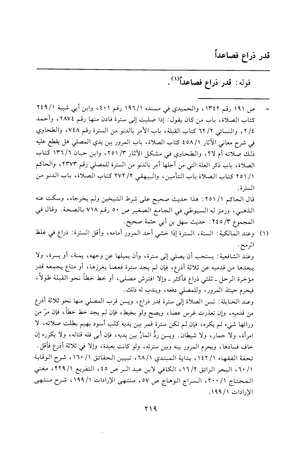 (¬١) وعند المالكية: السنة، السترة إذا خشي أحد المرور أمامه، وأقل السترة: ذراع في غلظ الرمح.