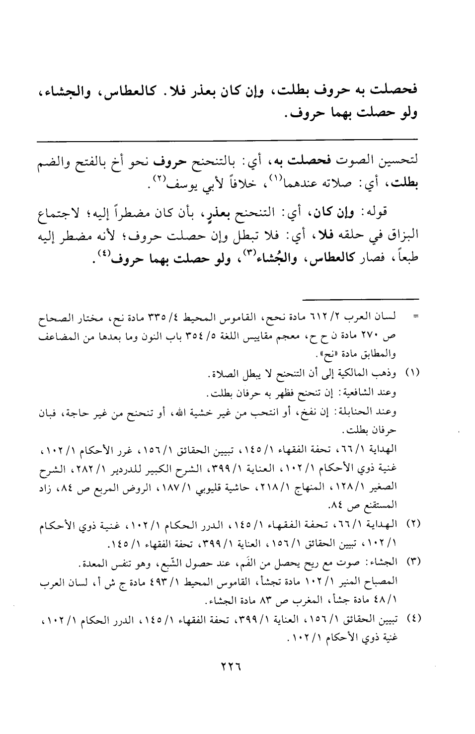 قوله: وإن كان، أي: التنحنح بعذرٍ، بأن كان مضطرًا إليه؛ لاجتماع البزاق في حلقه فلا، أي: فلا تبطل وإن حصلت حروف؛ لأنه مضطر إليه طبعًا، فصار كالعطاس، والجُشاء (¬٣)، ولو حصلت بهما حروف (¬٤).