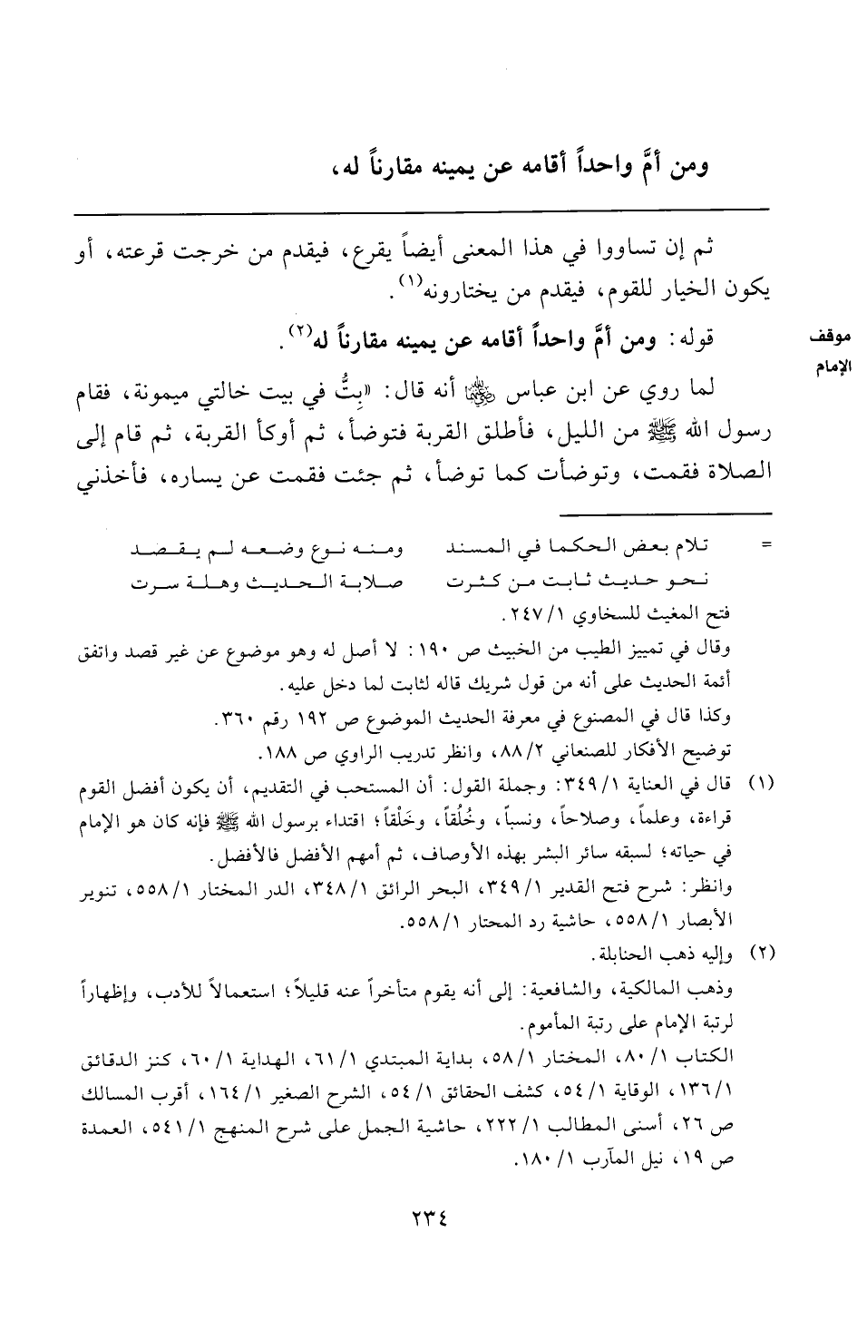 ومن أمَّ واحدًا أقامه عن يمينه مقارنًا له،