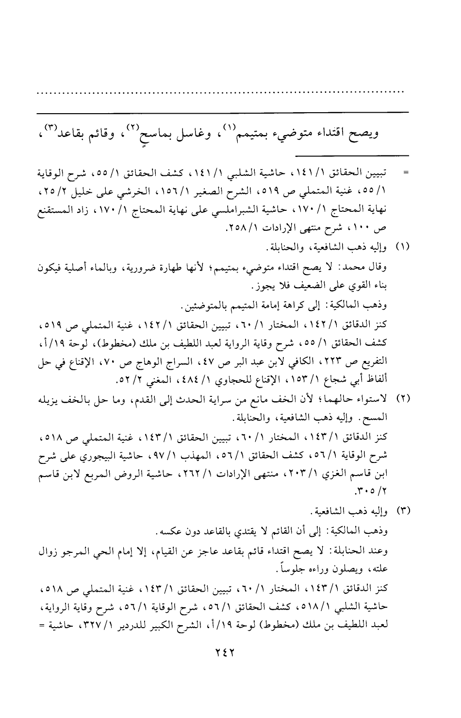 كنز الدقائق ١/ ١٤٢، المختار ١/ ٦٠، تبيين الحقائق ١/ ١٤٢، غنية المتملي ص ٥١٩، كشف الحقائق ١/ ٥٥، شرح وقاية الرواية لعبد اللطيف بن ملك (مخطوط)، لوحة ١٩/ أ، التفريع ص ٢٢٣، الكافي لابن عبد البر ص ٤٧، السراج الوهاج ص ٧٠، الإقناع في حل ألفاظ أبي شجاع ١/ ١٥٣، الإقناع للحجاوي ١/ ٤٨٤، المغني ٢/ ٥٢.
