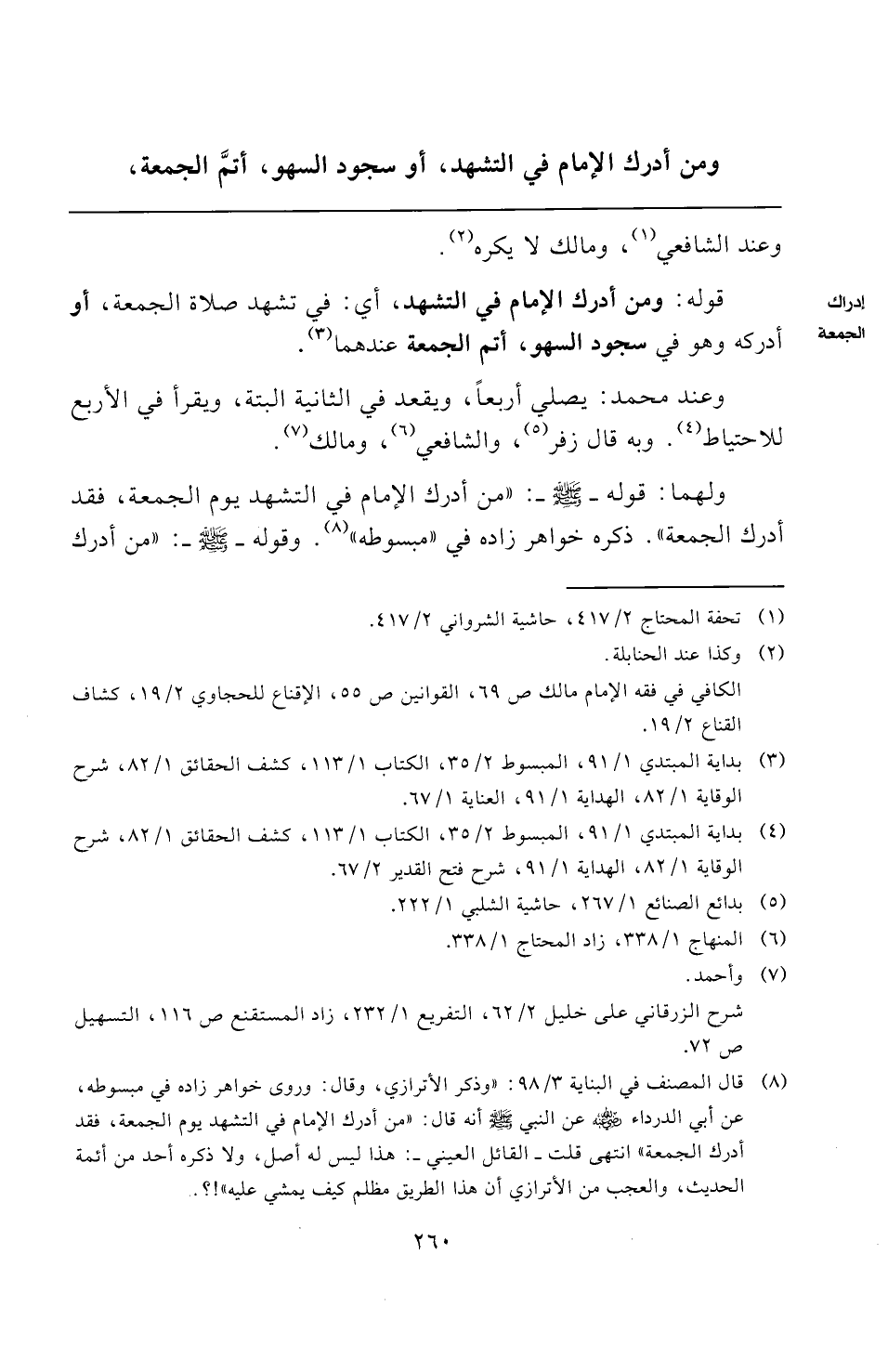 (¬٨) قال المصنف في البناية ٣/ ٩٨: "وذكر الأترازي، وقال: وروى خواهر زاده في مبسوطه، عن أبي الدرداء -رضي الله عنه- عن النبي -صلى الله عليه وسلم- أنه قال: "من أدرك الإمام في التشهد يوم الجمعة، فقد أدرك الجمعة" انتهى قلت -القائل العيني-: هذا ليس له أصل، ولا ذكره أحد من أئمة الحديث، والعجب من الأترازي أن هذا الطريق مظلم كيف يمشي عليه"!؟.