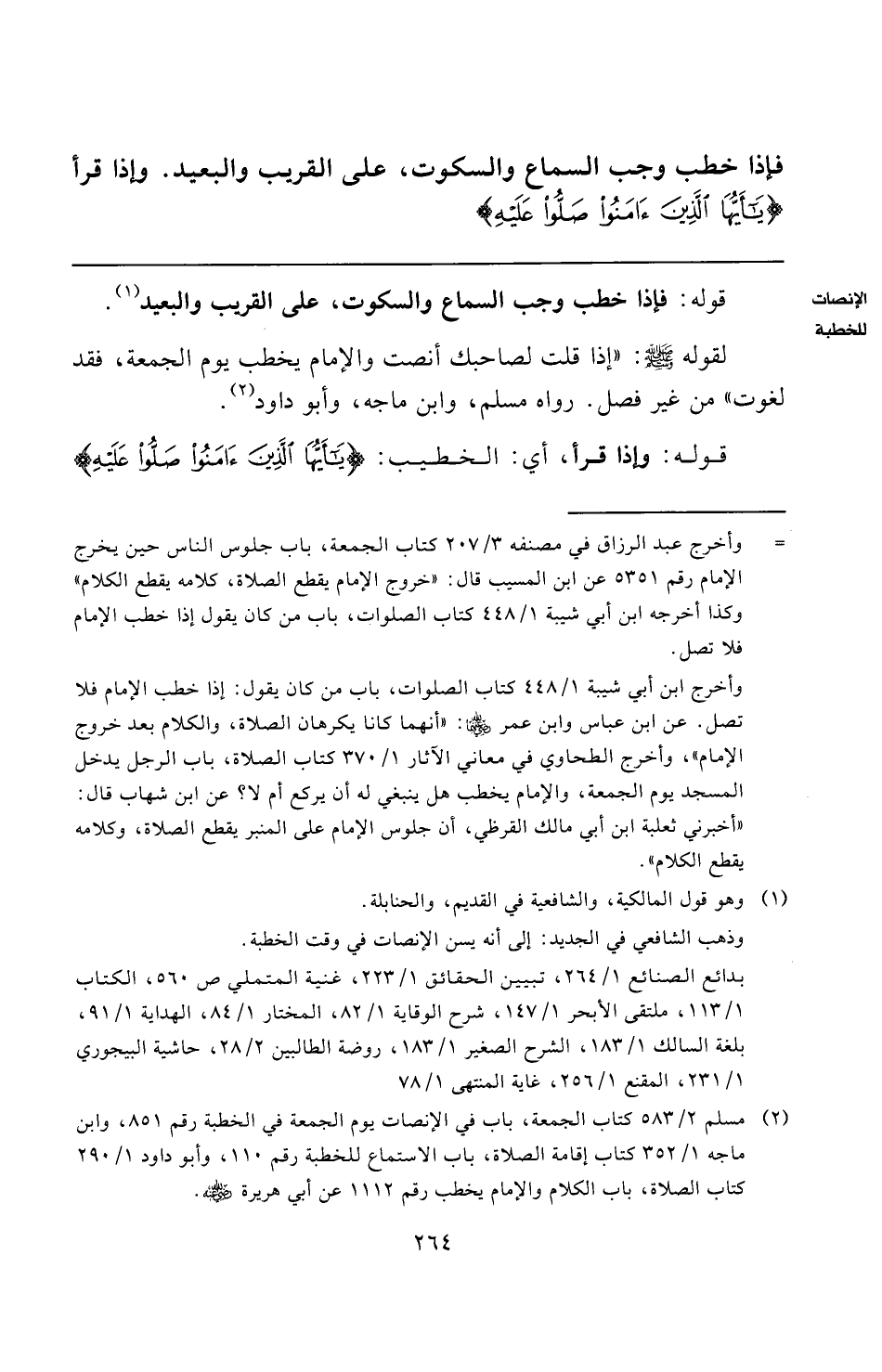 (¬٢) مسلم ٢/ ٥٨٣ كتاب الجمعة، باب في الإنصات يوم الجمعة في الخطبة رقم ٨٥١، وابن ماجه ١/ ٣٥٢ كتاب إقامة الصلاة، باب الاستماع للخطبة رقم ١١٠، وأبو داود ١/ ٢٩٠ كتاب الصلاة، باب الكلام والإمام يخطب رقم ١١١٢ عن أبي هريرة -رضي الله عنه-.