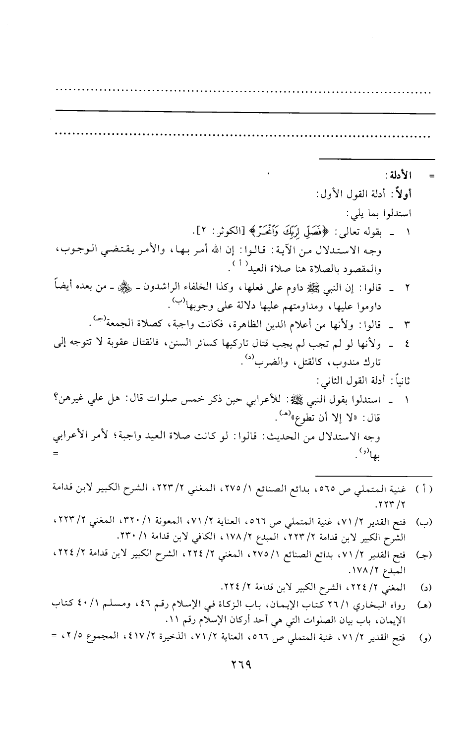 وجه الاستدلال من الآية: قالوا: إن الله أمر بها، والأمر يقتضى الوجوب، والمقصود بالصلاة هنا صلاة العيد (أ).