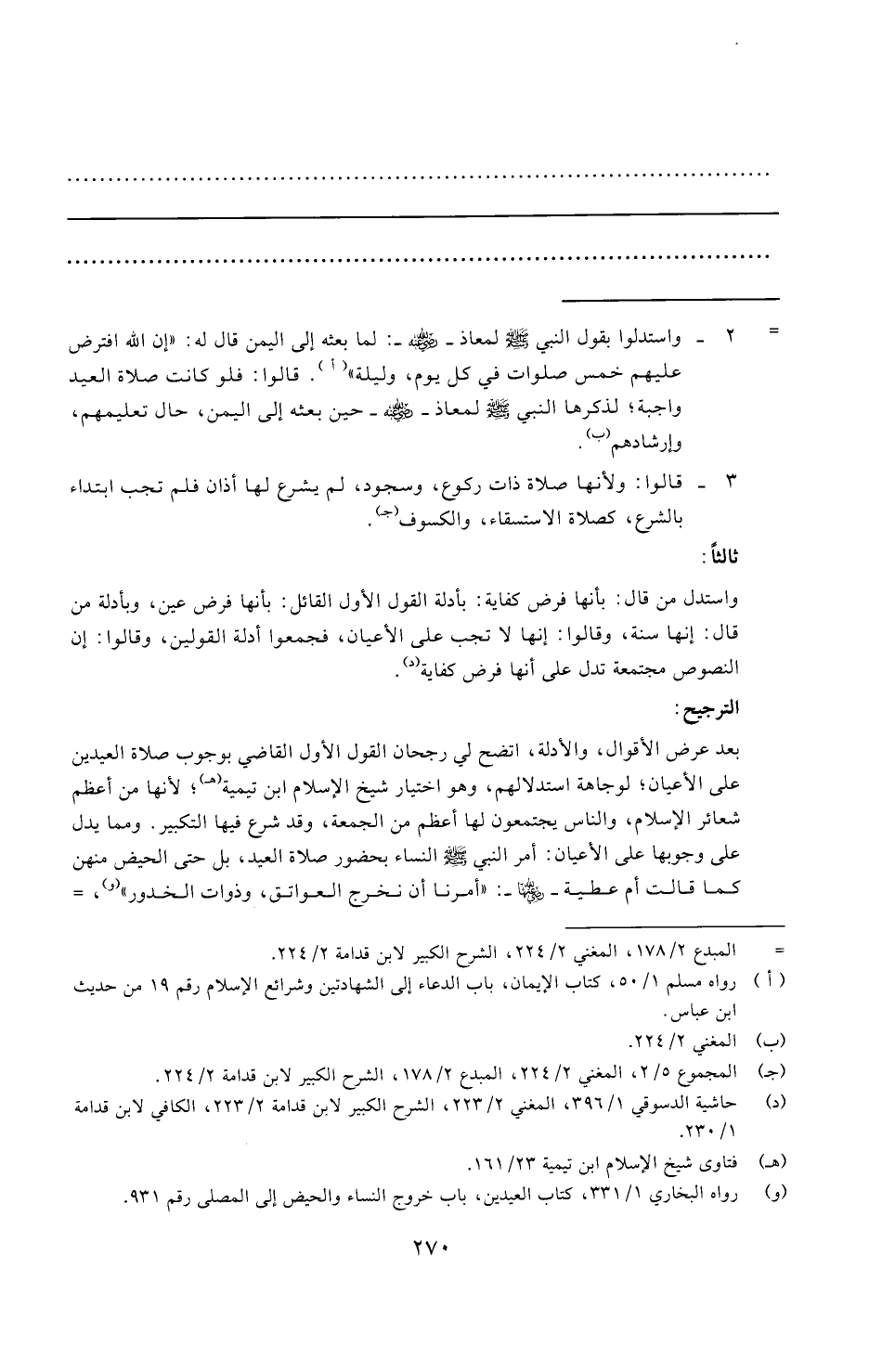 = ٢ - واستدلوا بقول النبي -صلى الله عليه وسلم- لمعاذ -رضي الله عنه-: لما بعثه إلى اليمن قال له: "إن الله افترض عليهم خمس صلوات في كل يوم، وليلة" (أ). قالوا: فلو كانت صلاة العيد واجبة؛ لذكرها النبي -صلى الله عليه وسلم- لمعاذ -رضي الله عنه- حين بعثه إلى اليمن، حال تعليمهم، وإرشادهم (ب).