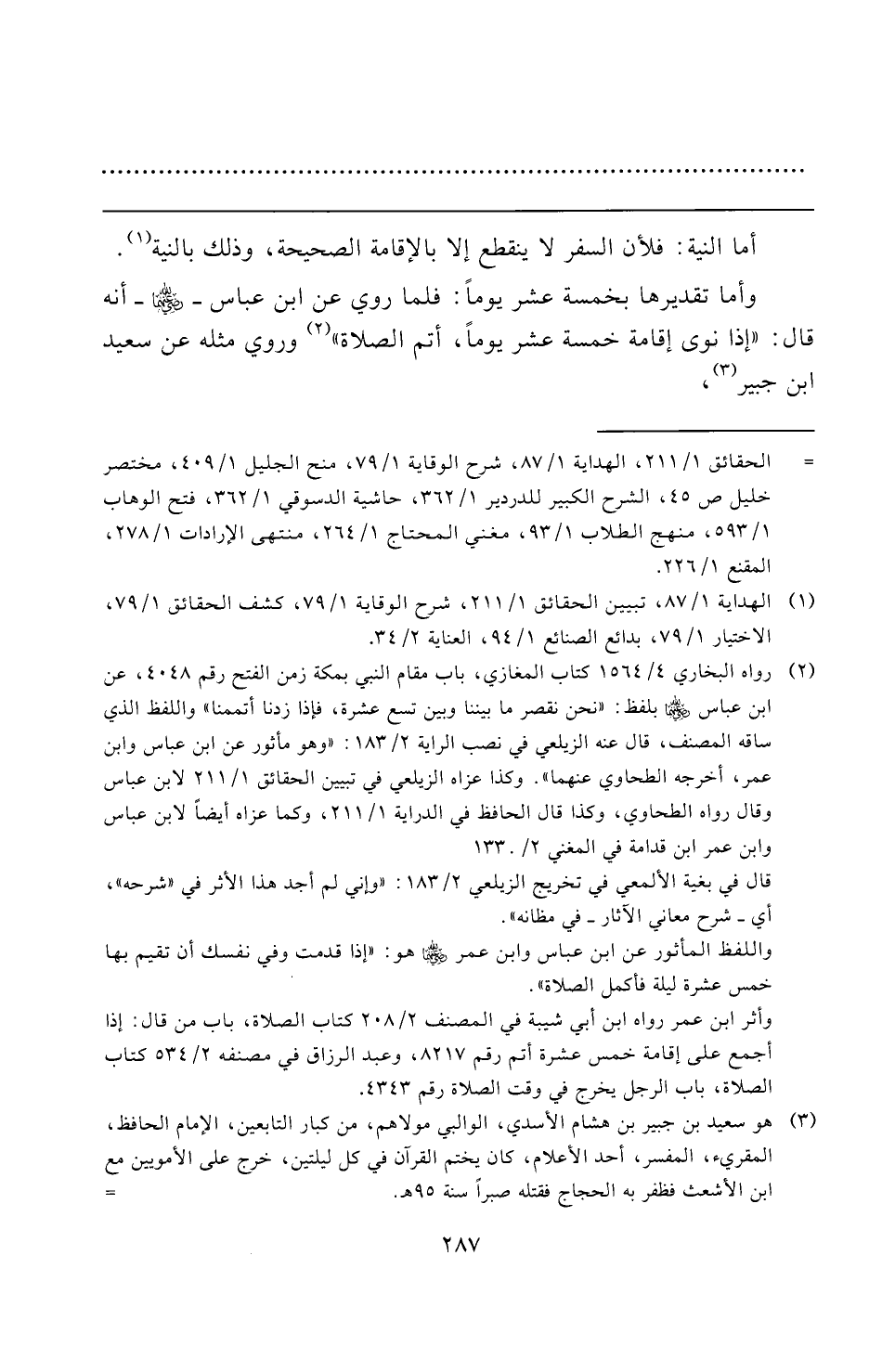 (¬٢) رواه البخاري ٤/ ١٥٦٤ كتاب المغازي، باب مقام النبي بمكة زمن الفتح رقم ٤٠٤٨، عن ابن عباس -رضي الله عنهما- بلفظ: "نحن نقصر ما بيننا وبين تسع عشرة، فإذا زدنا أتممنا" واللفظ الذي ساقه المصنف، قال عنه الزيلعي في نصب الراية ٢/ ١٨٣: "وهو مأثور عن ابن عباس وابن عمر، أخرجه الطحاوي عنهما". وكذا عزاه الزيلعي في تبيين الحقائق ١/ ٢١١ لابن عباس وقال رواه الطحاوي، وكذا قال الحافظ في الدراية ١/ ٢١١، وكما عزاه أيضًا لابن عباس وابن عمر ابن قدامة في المغني ٢/ ١٣٣.