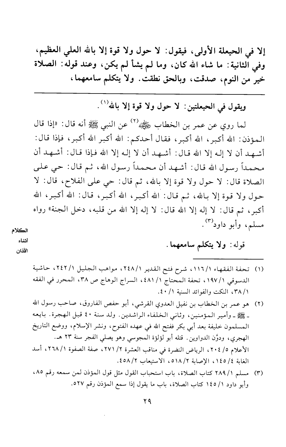 إلا في الحيعلة الأولى، فيقول: لا حول ولا قوة إلا بالله العلي العظيم، وفي الثانية: ما شاء الله كان، وما لم يشأ لم يكن، وعند قوله: الصلاة خير من النوم، صدقت، وبالحق نطقت. ولا يتكلم سامعهما،