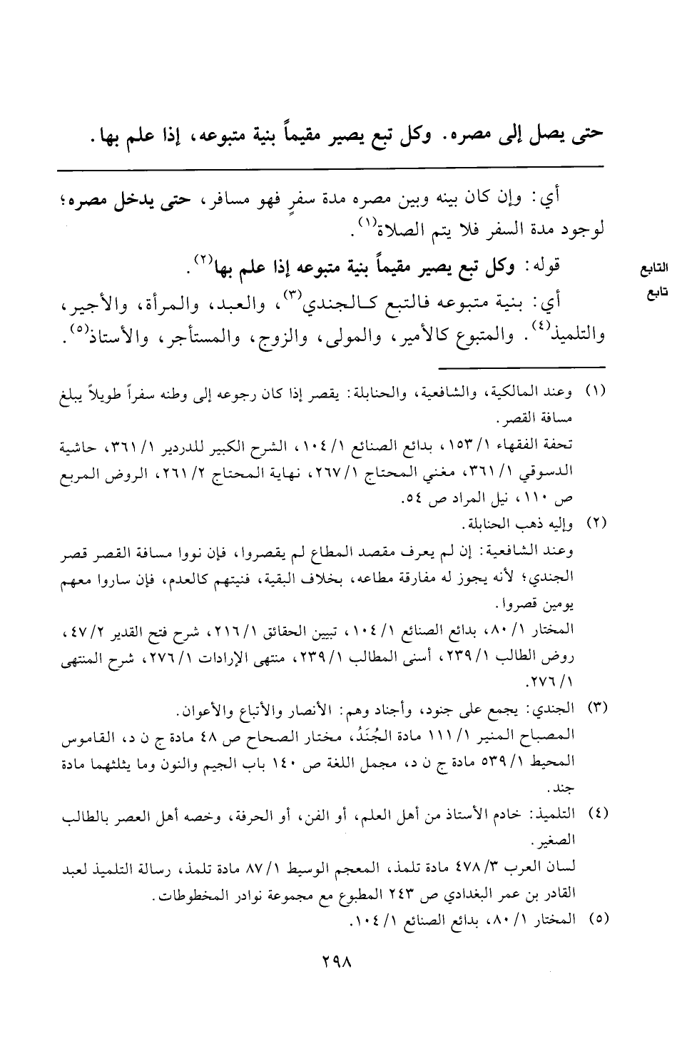 أي: بنية متبوعه فالتبع كالجندي (¬٣)، والعبد، والمرأة، والأجير، والتلميذ (¬٤). والمتبوع كالأمير، والمولى، والزوج، والمستأجر، والأستاذ (¬٥).