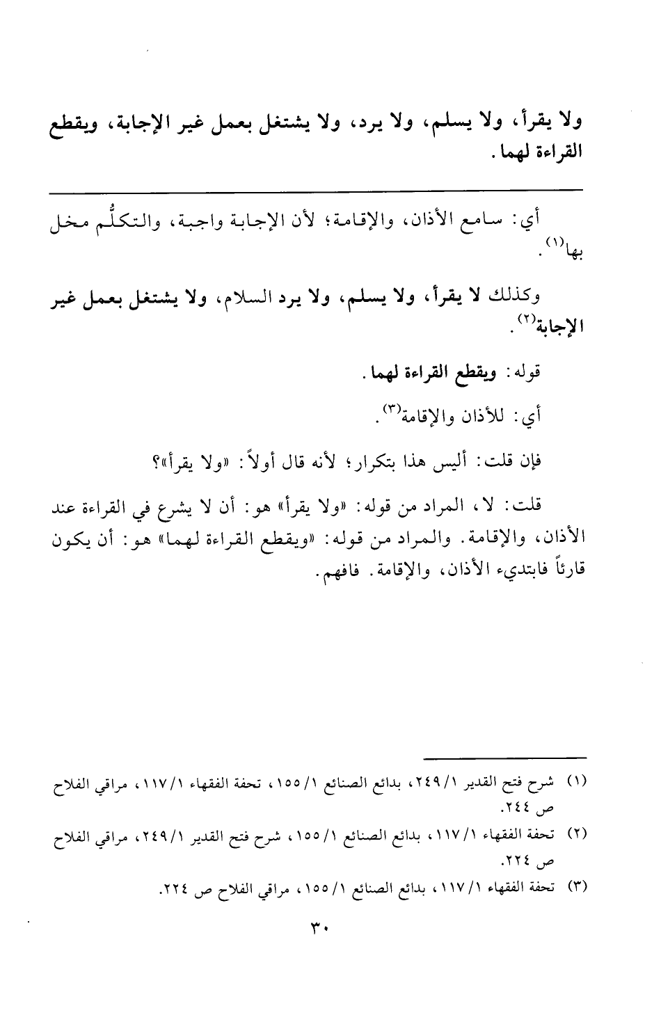 وكذلك لا يقرأ، ولا يسلم، ولا يرد السلام، ولا يشتغل بعمل غير الإجابة (¬٢).