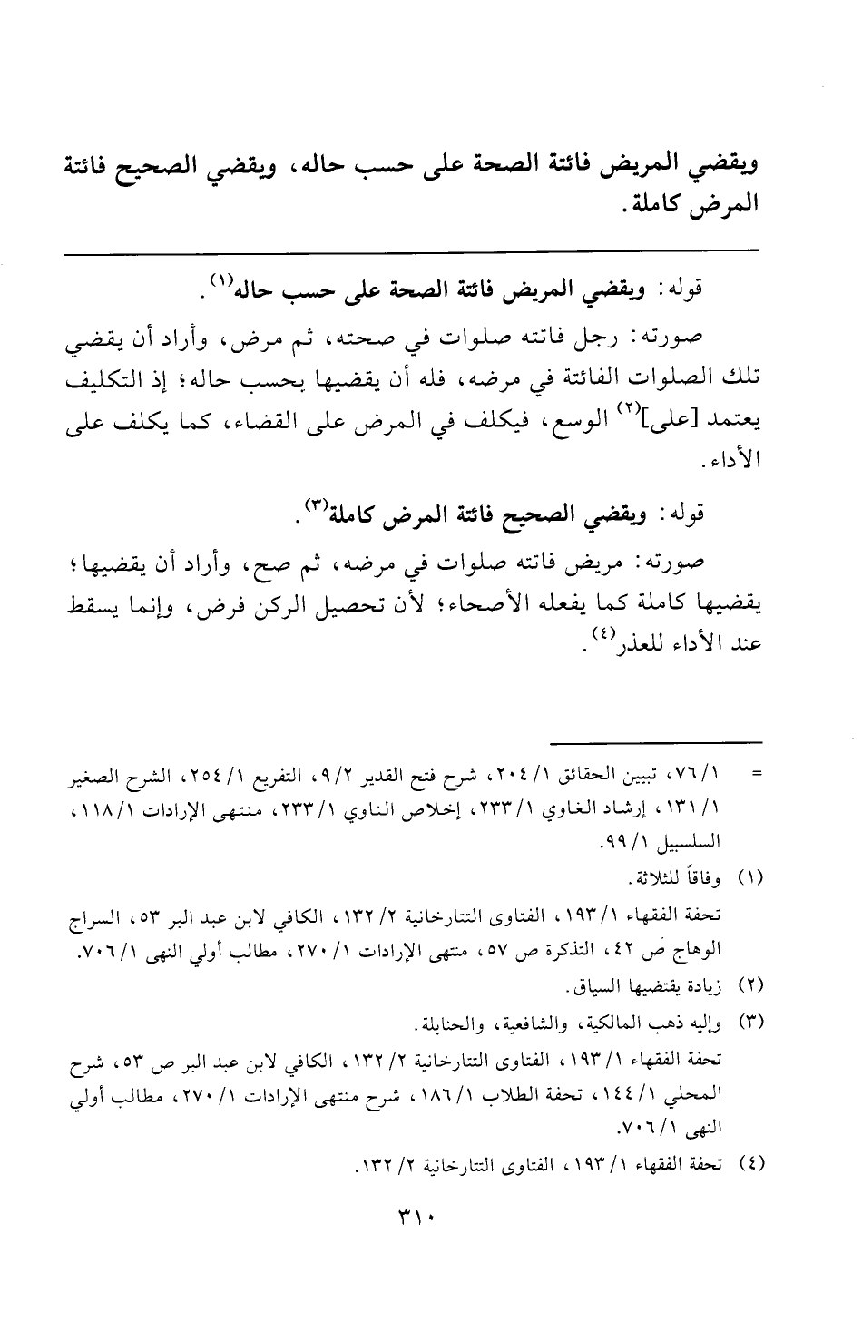 ويقضي المريض فائتة الصحة على حسب حاله، ويقضي الصحيح فائتة المرض كاملة.