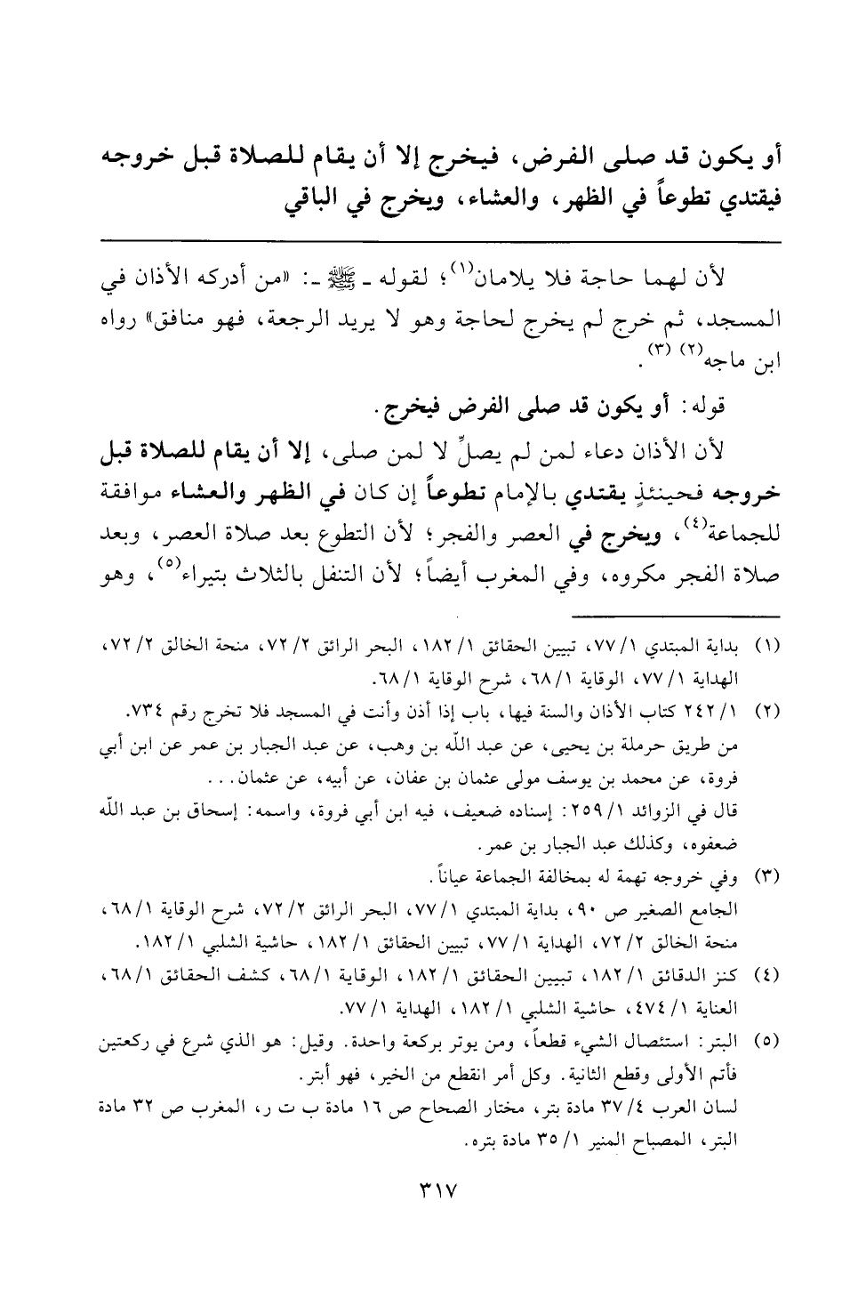 (¬١) بداية المبتدي ١/ ٧٧، تبيين الحقائق ١/ ١٨٢، البحر الرائق ٢/ ٧٢، منحة الخالق ٢/ ٧٢، الهداية ١/ ٧٧، الوقاية ١/ ٦٨، شرح الوقاية ١/ ٦٨.