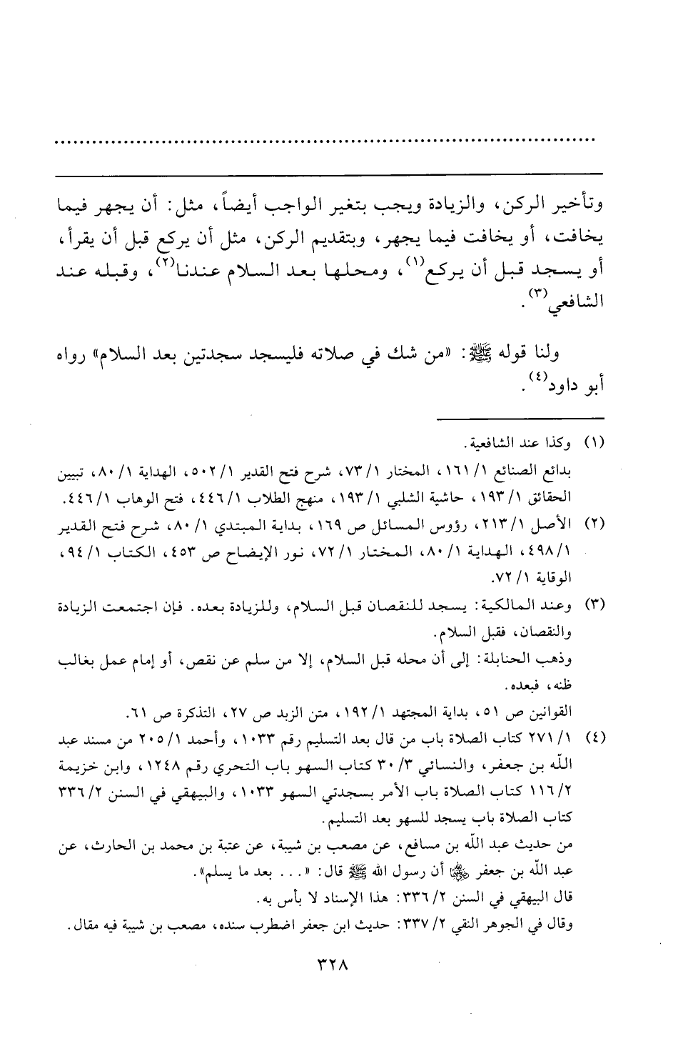 (¬٤) ١/ ٢٧١ كتاب الصلاة باب من قال بعد التسليم رقم ١٠٣٣، وأحمد ١/ ٢٠٥ من مسند عبد الله بن جعفر، والنسائي ٣/ ٣٠ كتاب السهو باب التحري رقم ١٢٤٨، وابن خزيمة ٢/ ١١٦ كتاب الصلاة باب الأمر بسجدتي السهو ١٠٣٣، والبيهقي في السنن ٢/ ٣٣٦ كتاب الصلاة باب يسجد للسهو بعد التسليم.